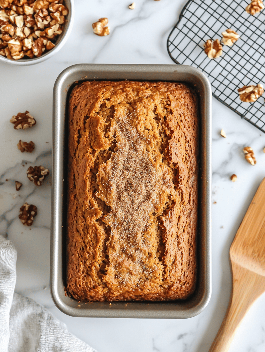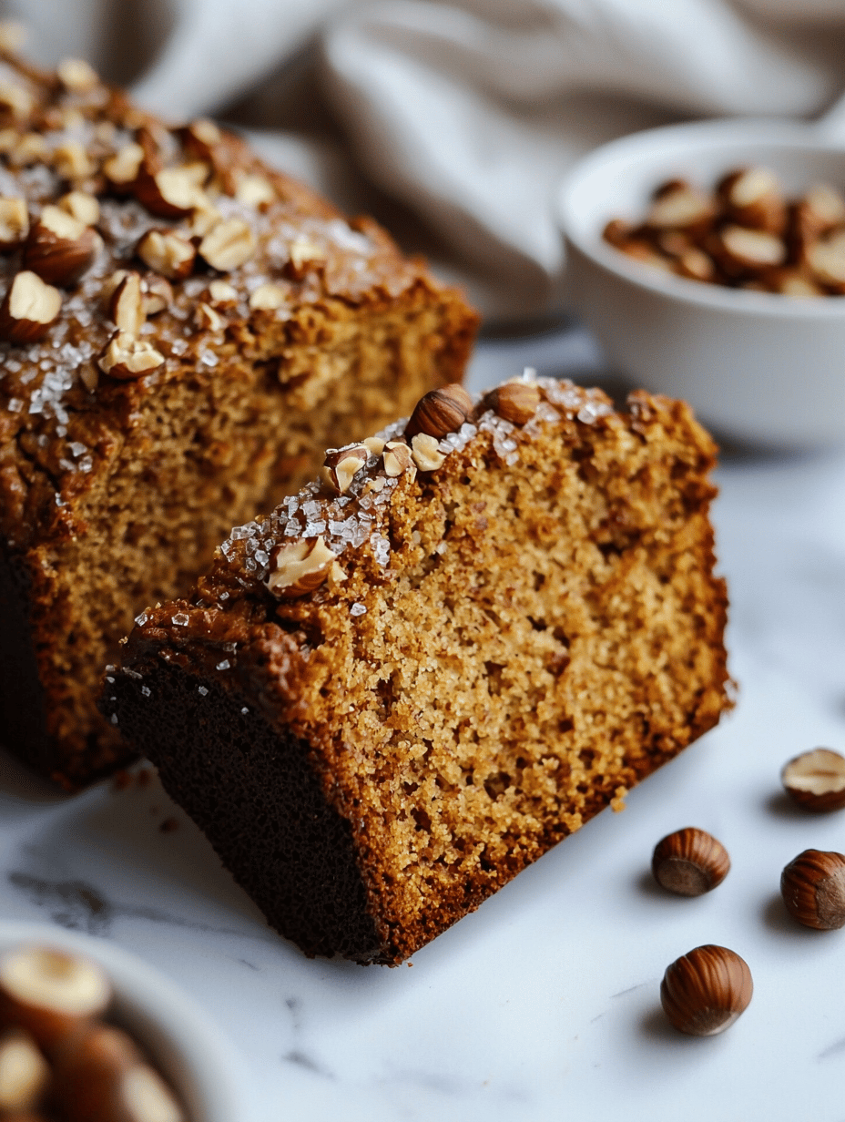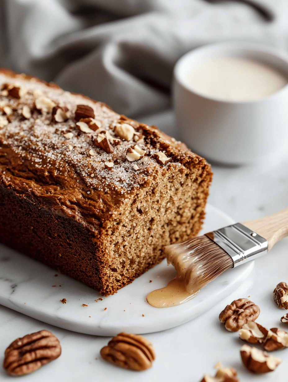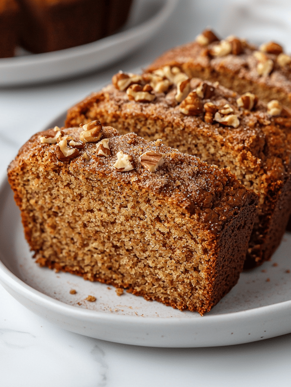 Let the bread cool slightly before slicing. Enjoy the moist, tender crumb with a crunchy nut topping and sweet cinnamon accents.