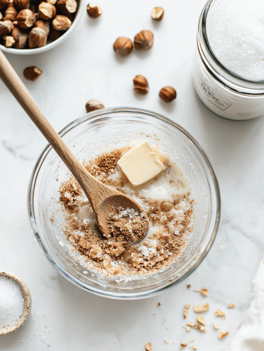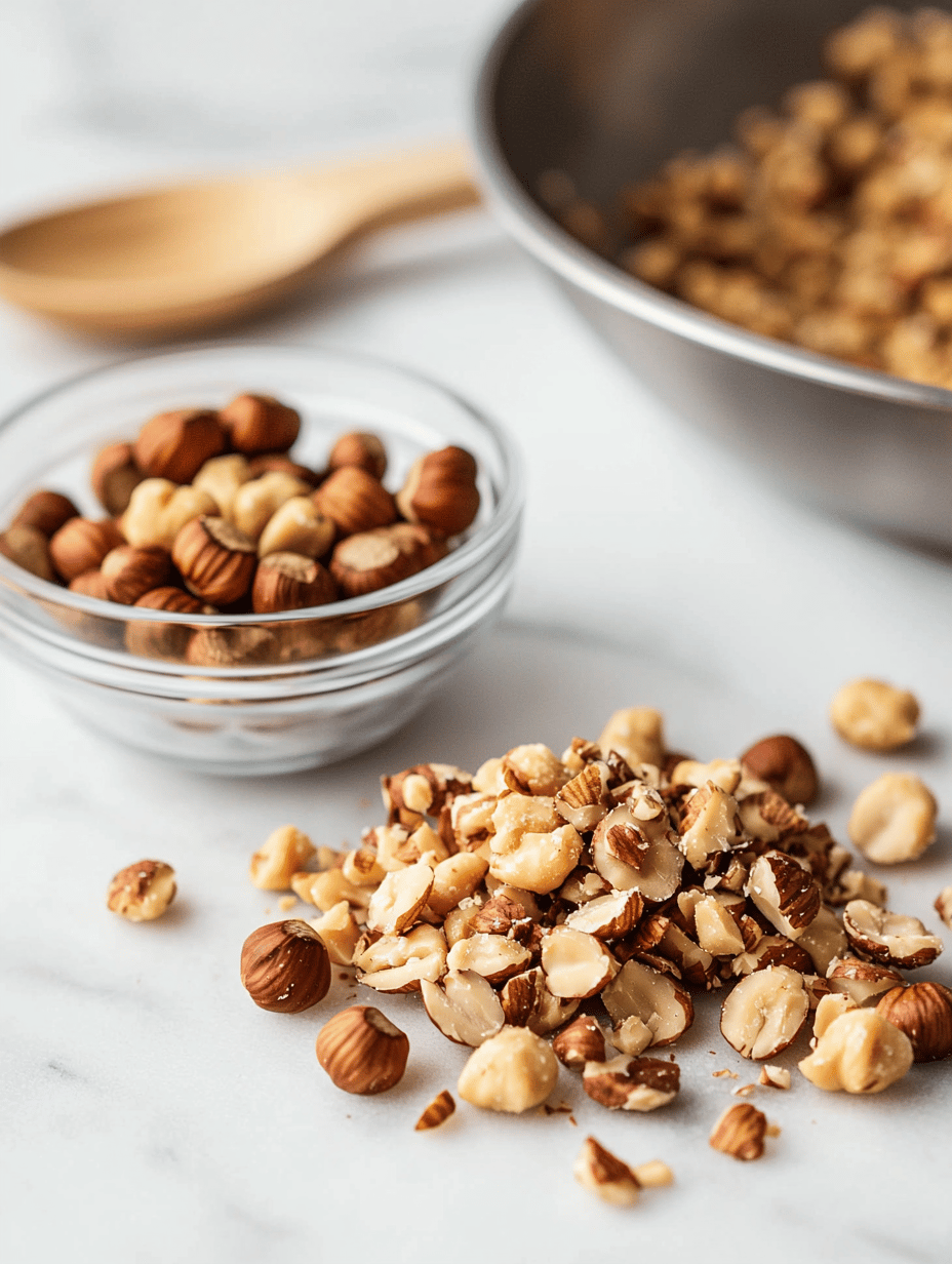 Toast the hazelnuts in a dry skillet or oven until fragrant and golden, then roughly chop and set aside to cool.