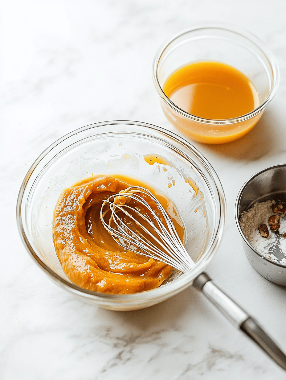 In a separate bowl, beat the eggs, then stir in the pumpkin puree and vegetable oil until smooth and combined.