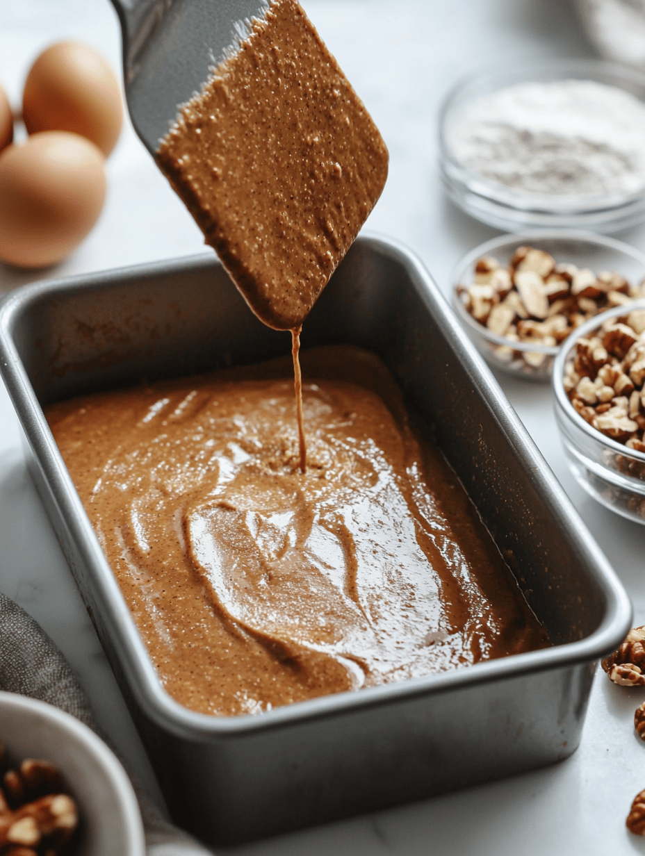 Pour the batter into your prepared loaf pan, smoothing the top with a spatula.