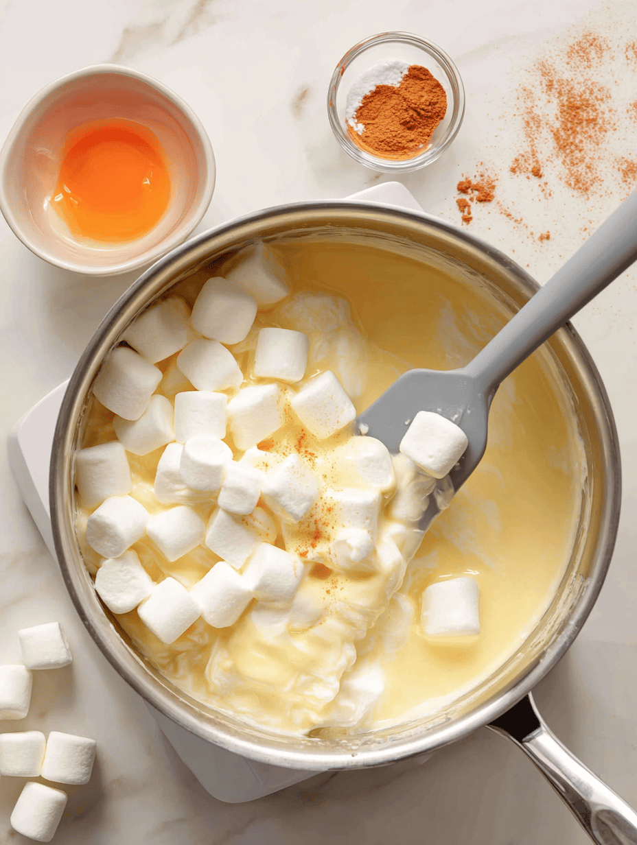 Add the marshmallows gradually to the melted butter, stirring constantly with a spatula. Continue stirring until the marshmallows are completely melted and glossy, with a soft bubbling sound filling the air.