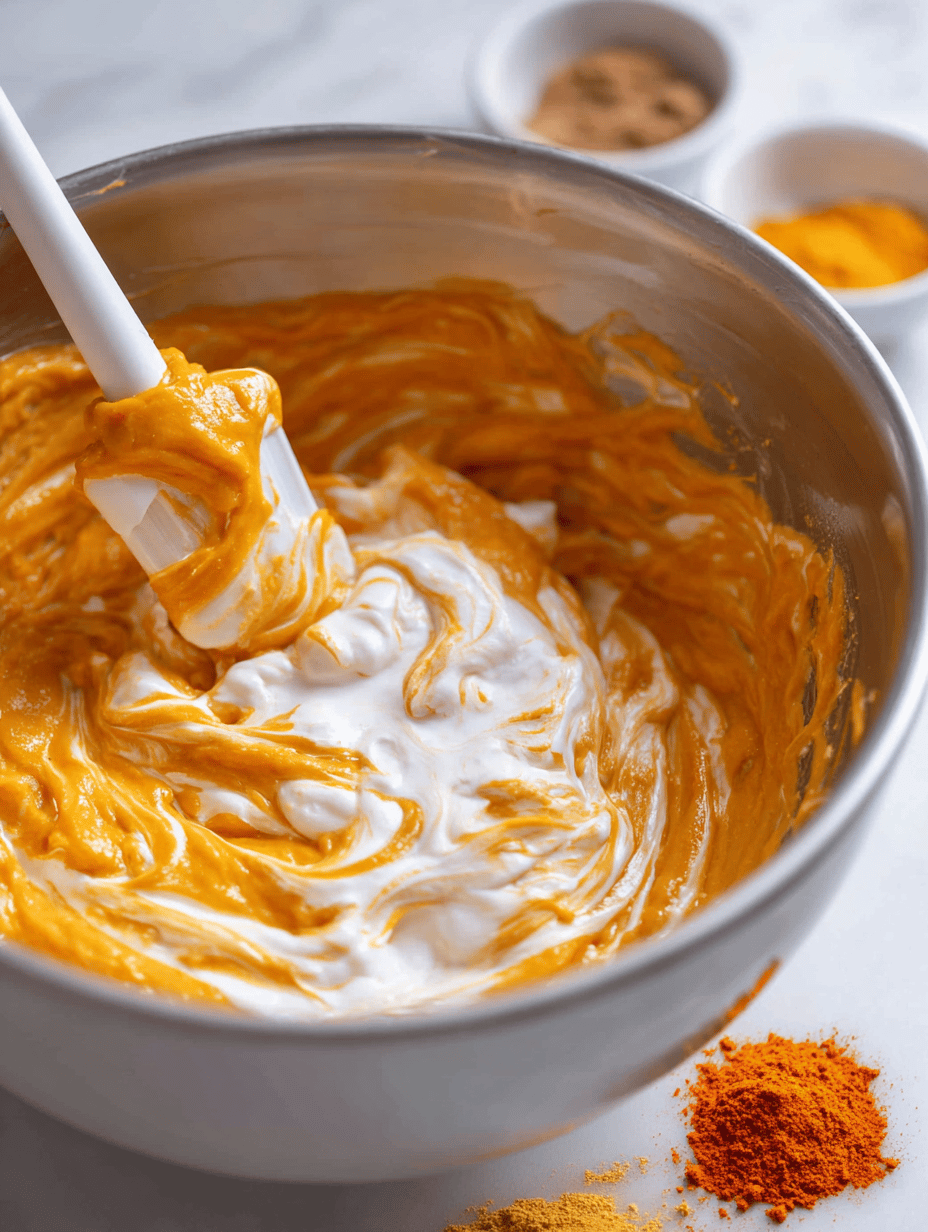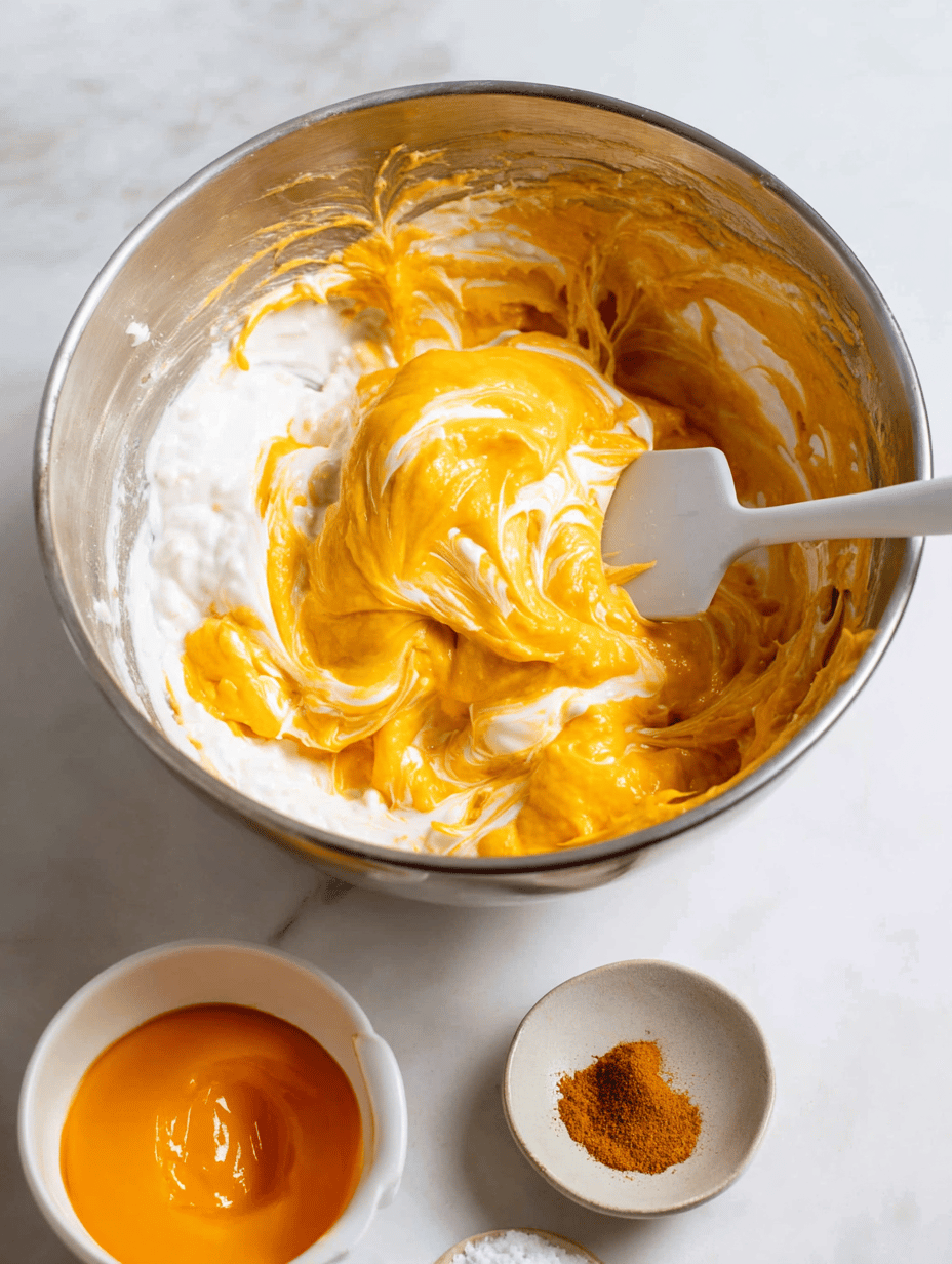 Stir in the pumpkin puree and ground cinnamon, mixing quickly until the mixture turns a warm, pumpkin-orange hue and becomes smooth and slightly thickened.