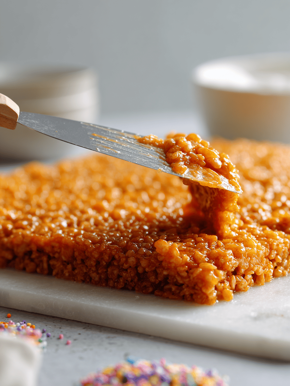 Pour the mixture into your prepared pan. Use a spatula or your hands (greased if necessary) to press it down evenly, creating a firm, compact layer. Add colorful sprinkles or candies on top if you like.