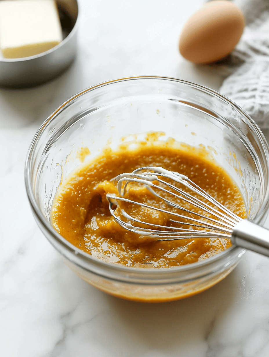 In a separate bowl, whisk together the milk, pumpkin puree, eggs, and melted butter until smooth and integrated.