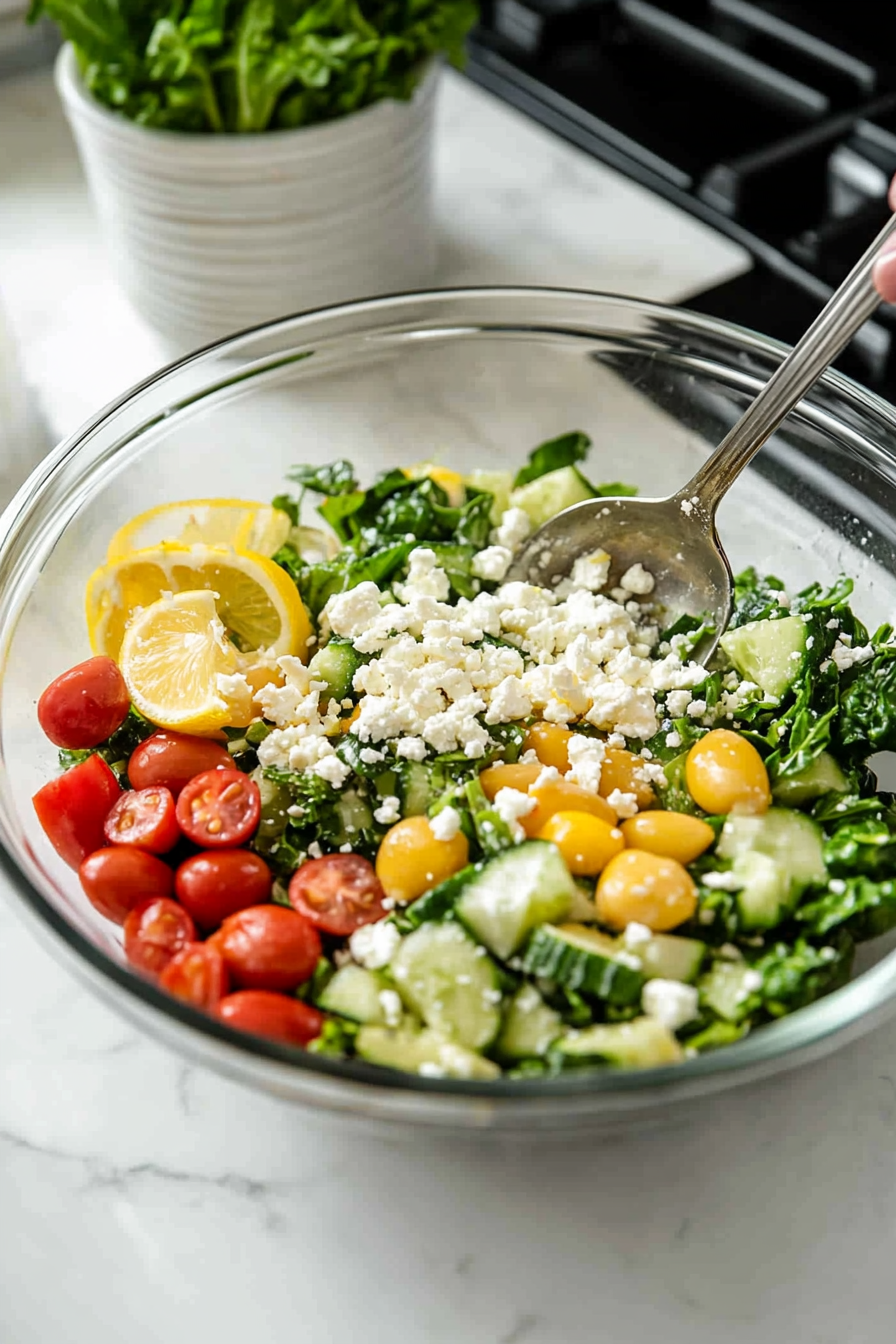 Add Feta and Beans: Crumble feta into large pieces over the salad base. Using a slotted spoon, add the bean mixture (garlic and lemon zest included) to the salad.