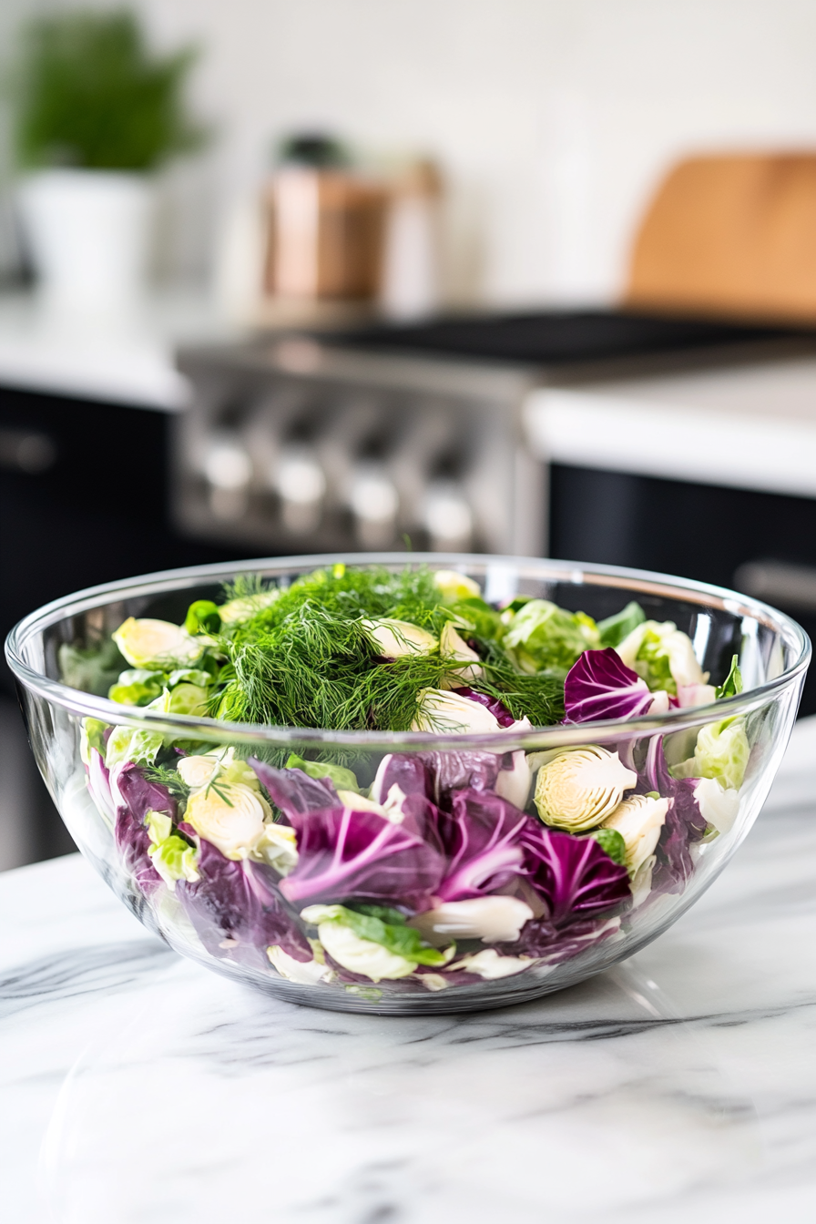 Prepare Salad Base: In a large bowl, combine radicchio, brussels sprouts, and ΒΌ cup of dill.
