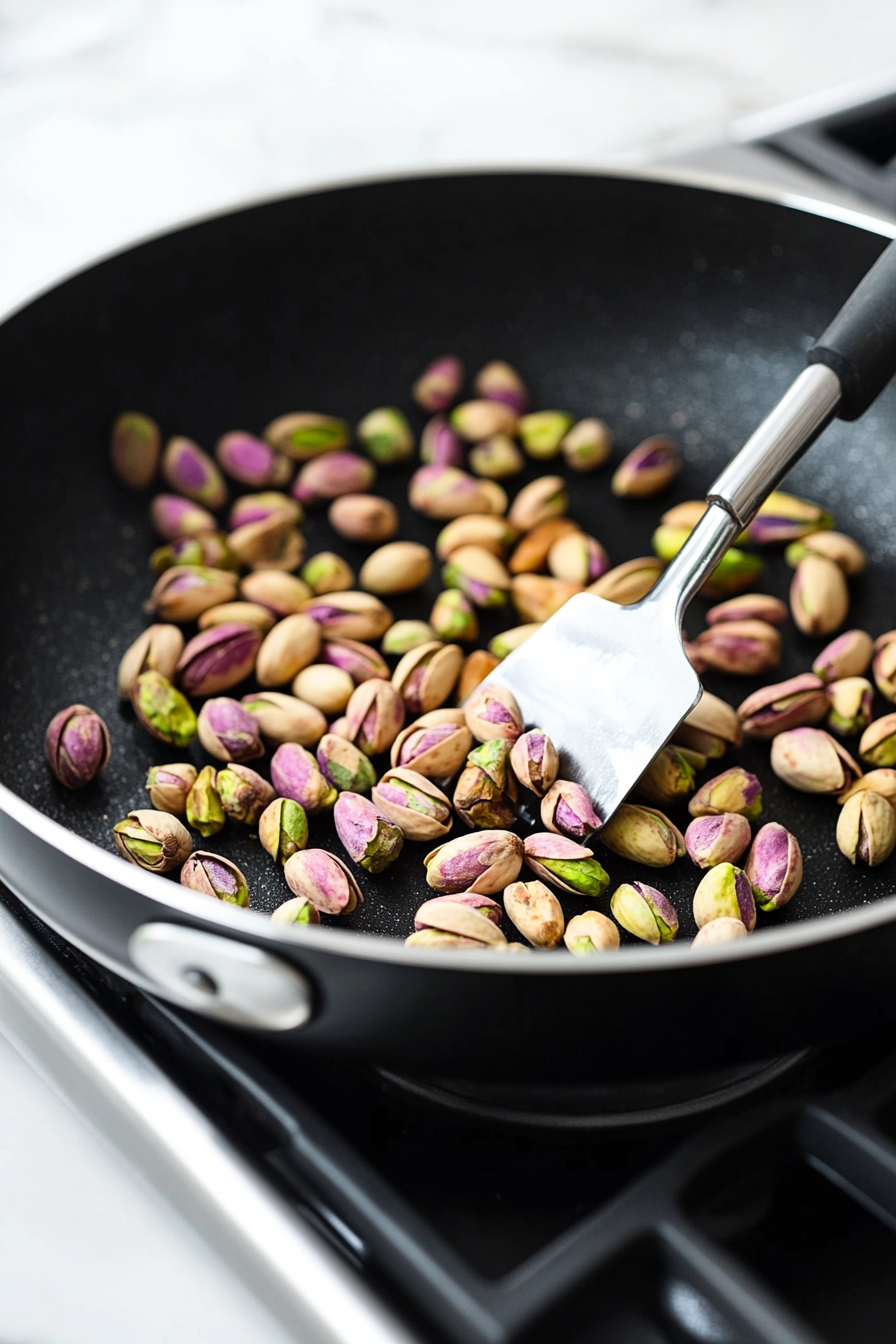 Toast Pistachios: In a small skillet, toast pistachios over medium heat, tossing occasionally, until golden brown (about 5β8 minutes). Transfer to a cutting board and coarsely chop.