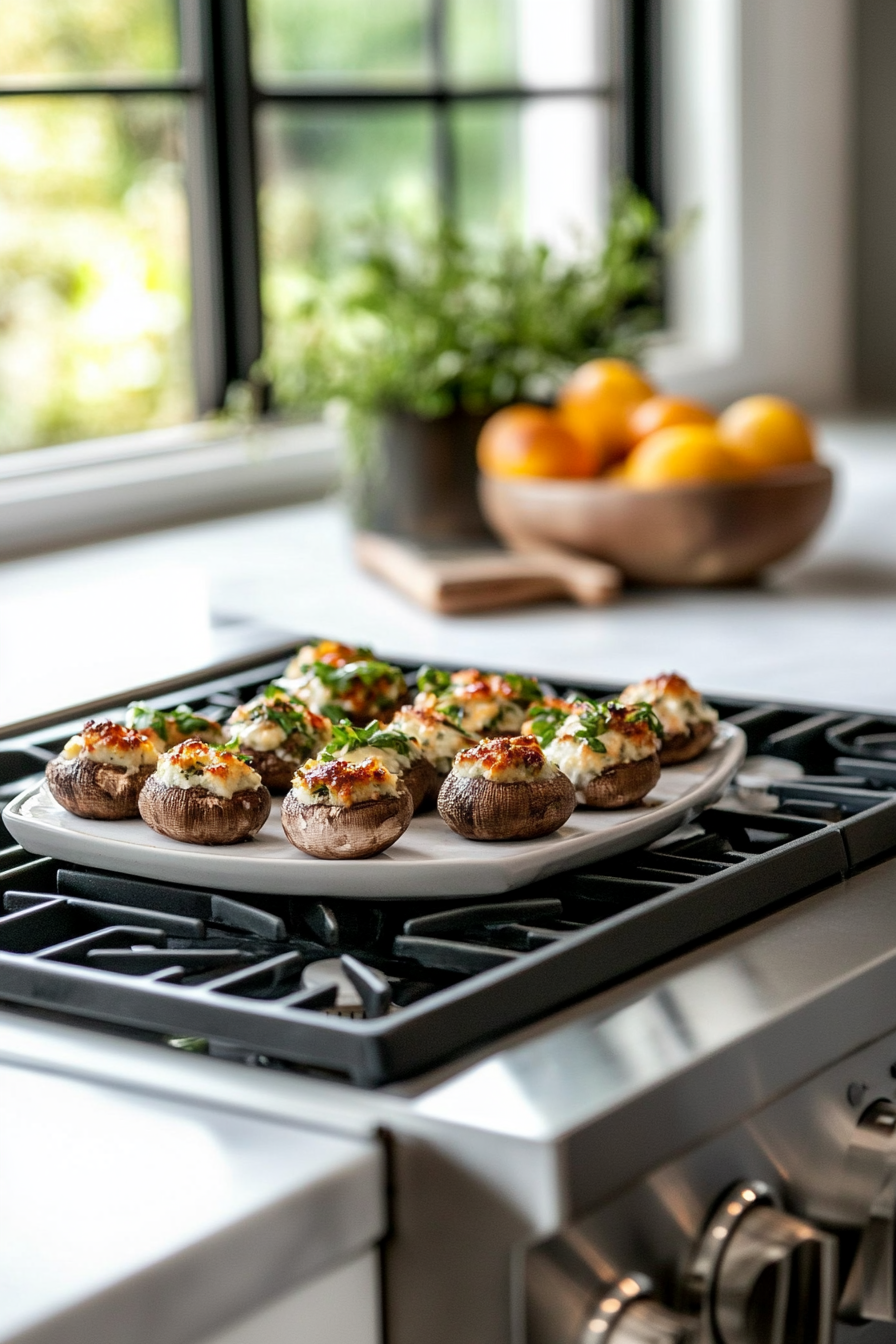 Fill the mushrooms with the crab mixture, top with the remaining cheese, and bake for 15 minutes. Serve warm.