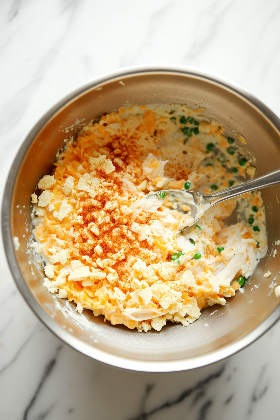 Beat the egg and mix with crab meat, crushed crackers, ¼ cup cheddar cheese, Old Bay seasoning, salt, and pepper.