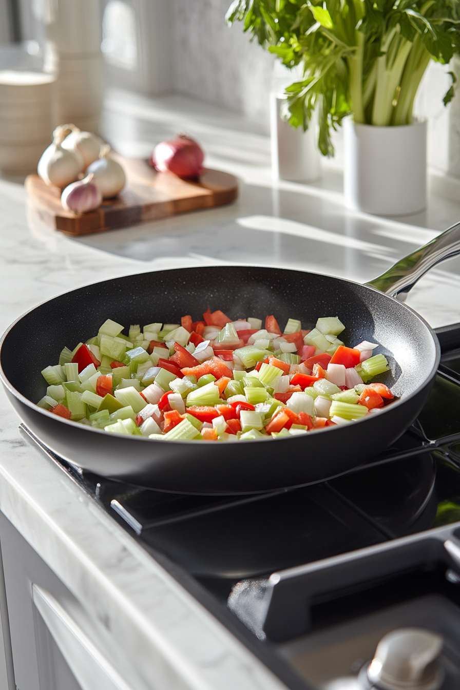 Sauté the celery, onion, garlic, and bell peppers for 2 minutes, until tender.