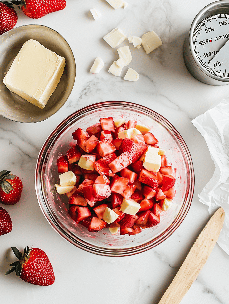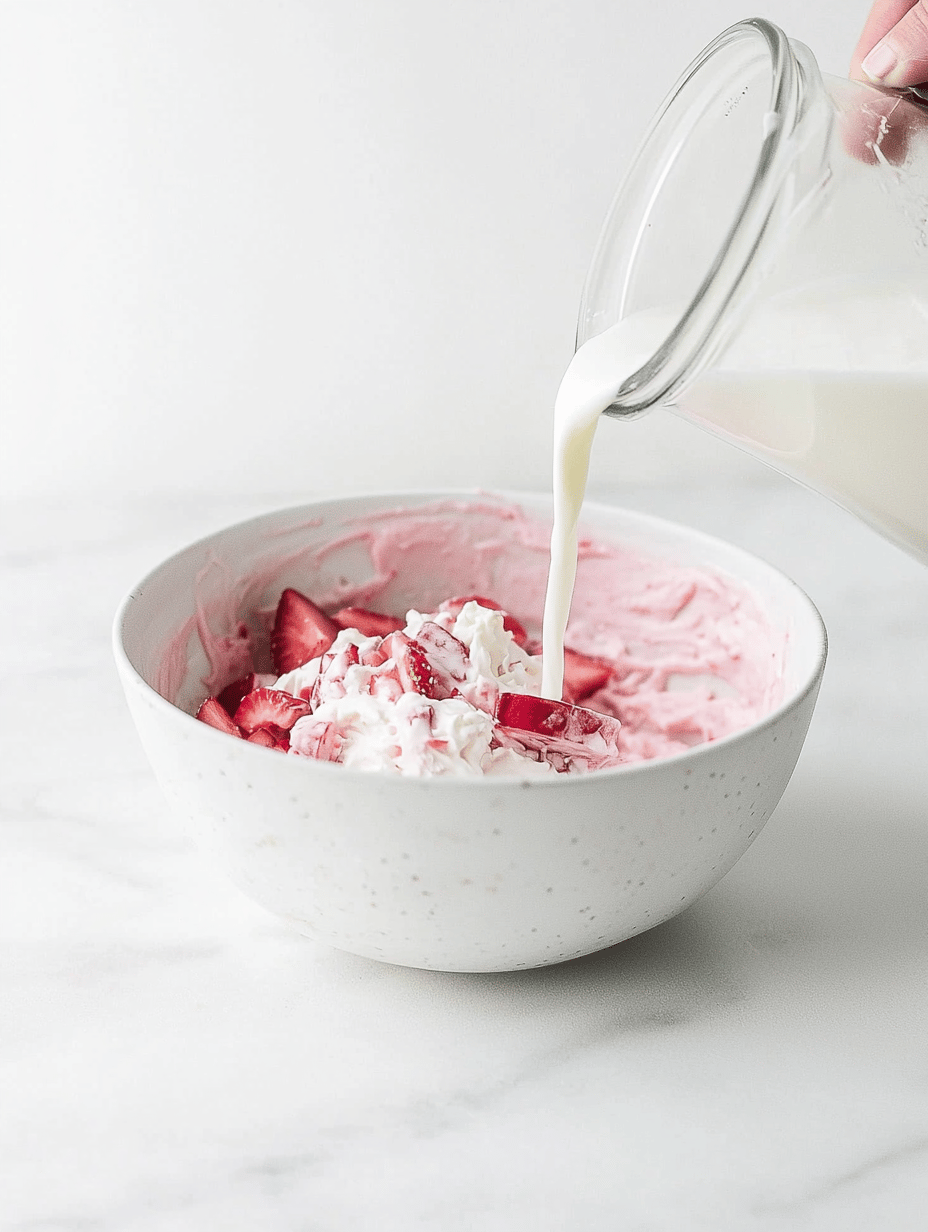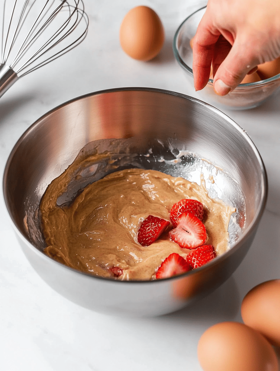 Divide the batter evenly into two bowls. To one, fold in the diced rhubarb gently; to the other, fold in the strawberry puree for a vibrant swirl effect.