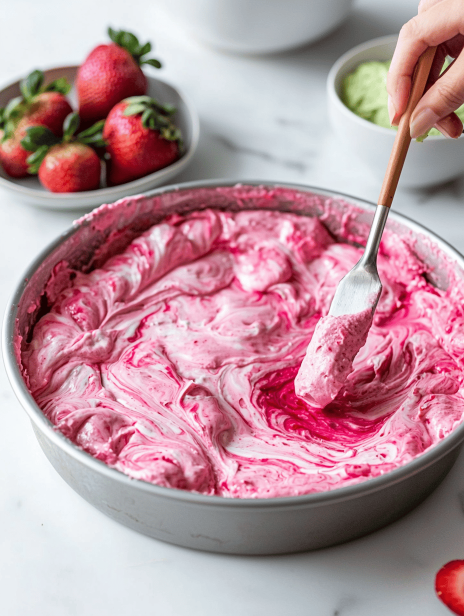 Spoon dollops of the rhubarb batter into the prepared pan, then add spoonfuls of the strawberry batter on top. Use a toothpick or skewer to gently swirl the two batters together, creating marbled patterns.