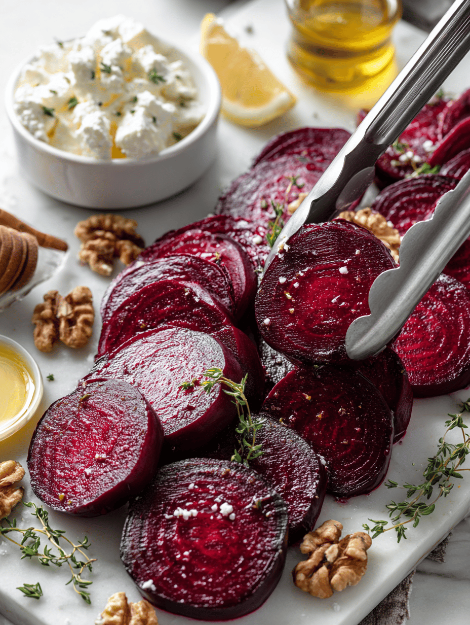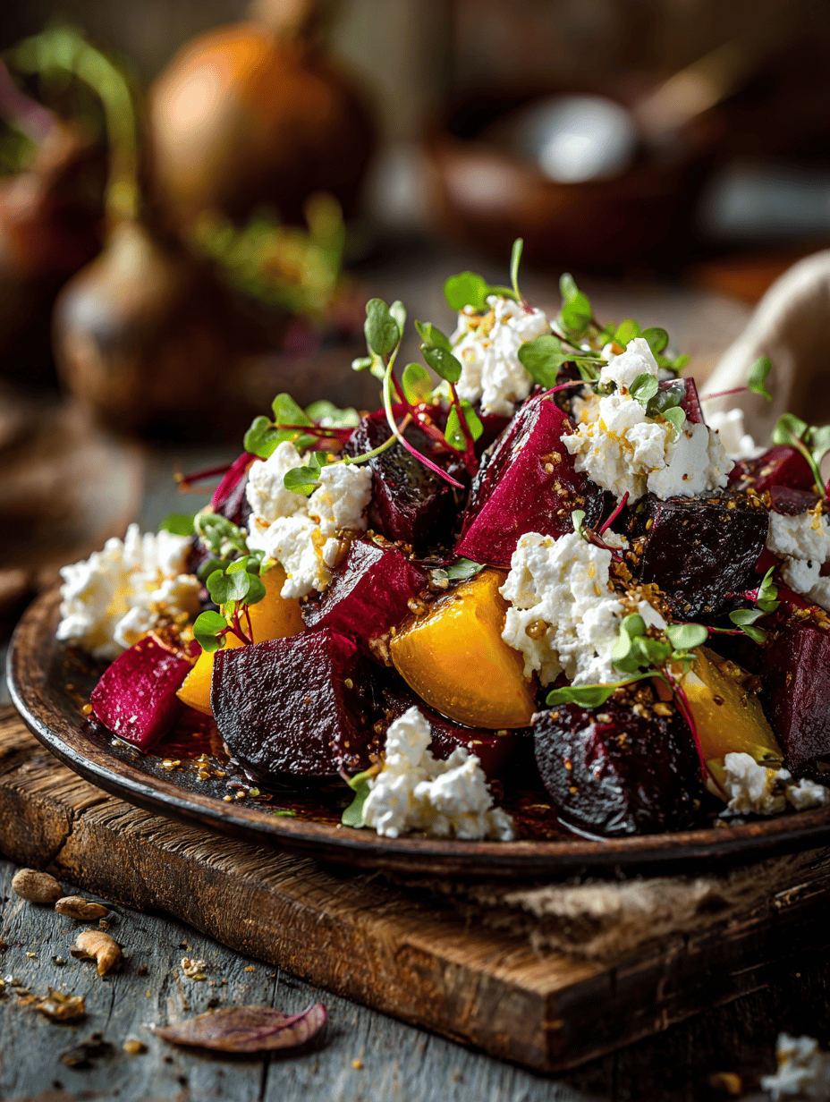 Peeling beets while warm makes skin removal easier. Let the goat cheese sit at room temperature before crumbling for a softer texture. Serve immediately to enjoy the fresh flavors and textures.
