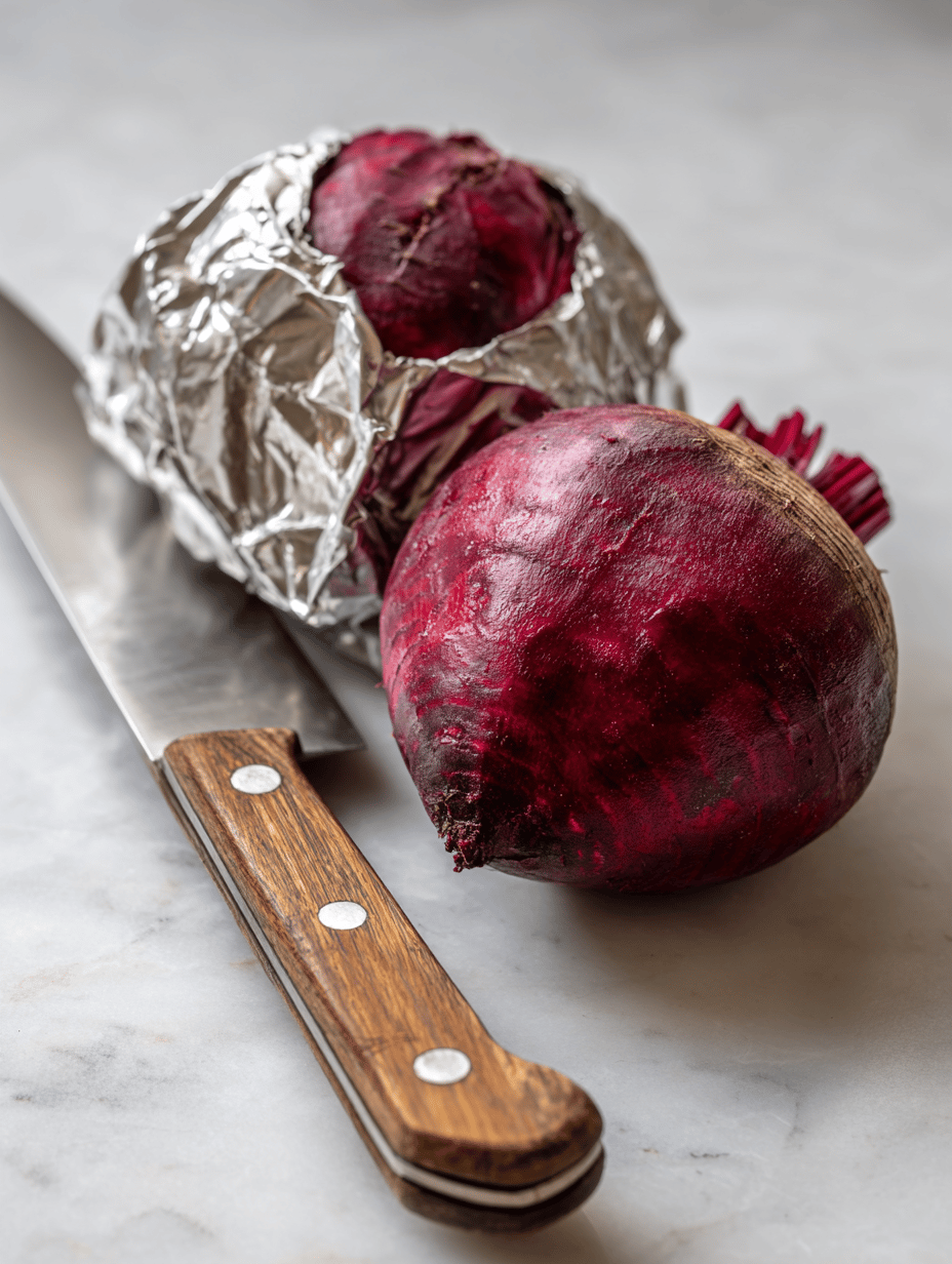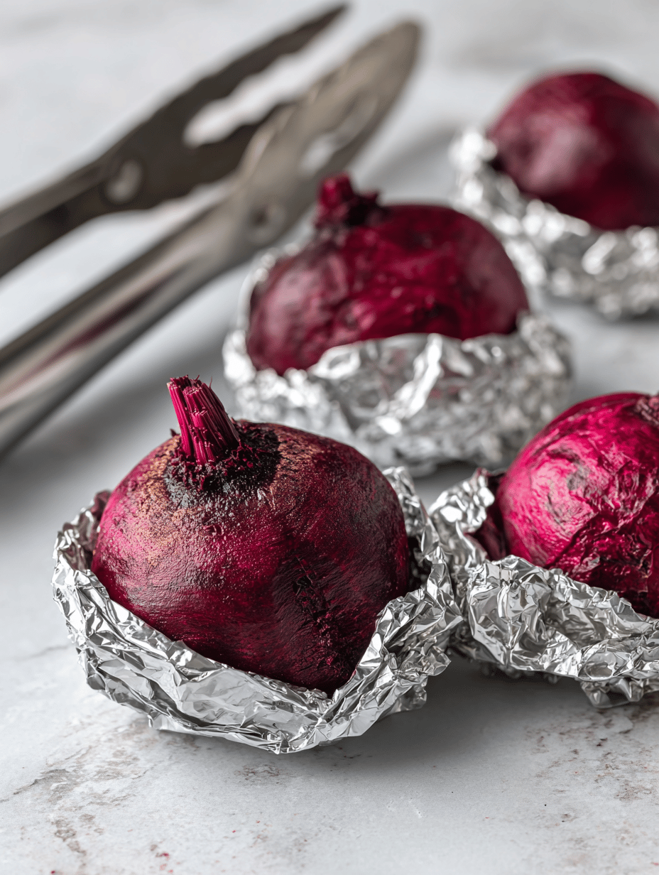 Preheat your oven to 200°C (390°F). Wrap each beet individually in aluminum foil and place them directly on the oven rack.