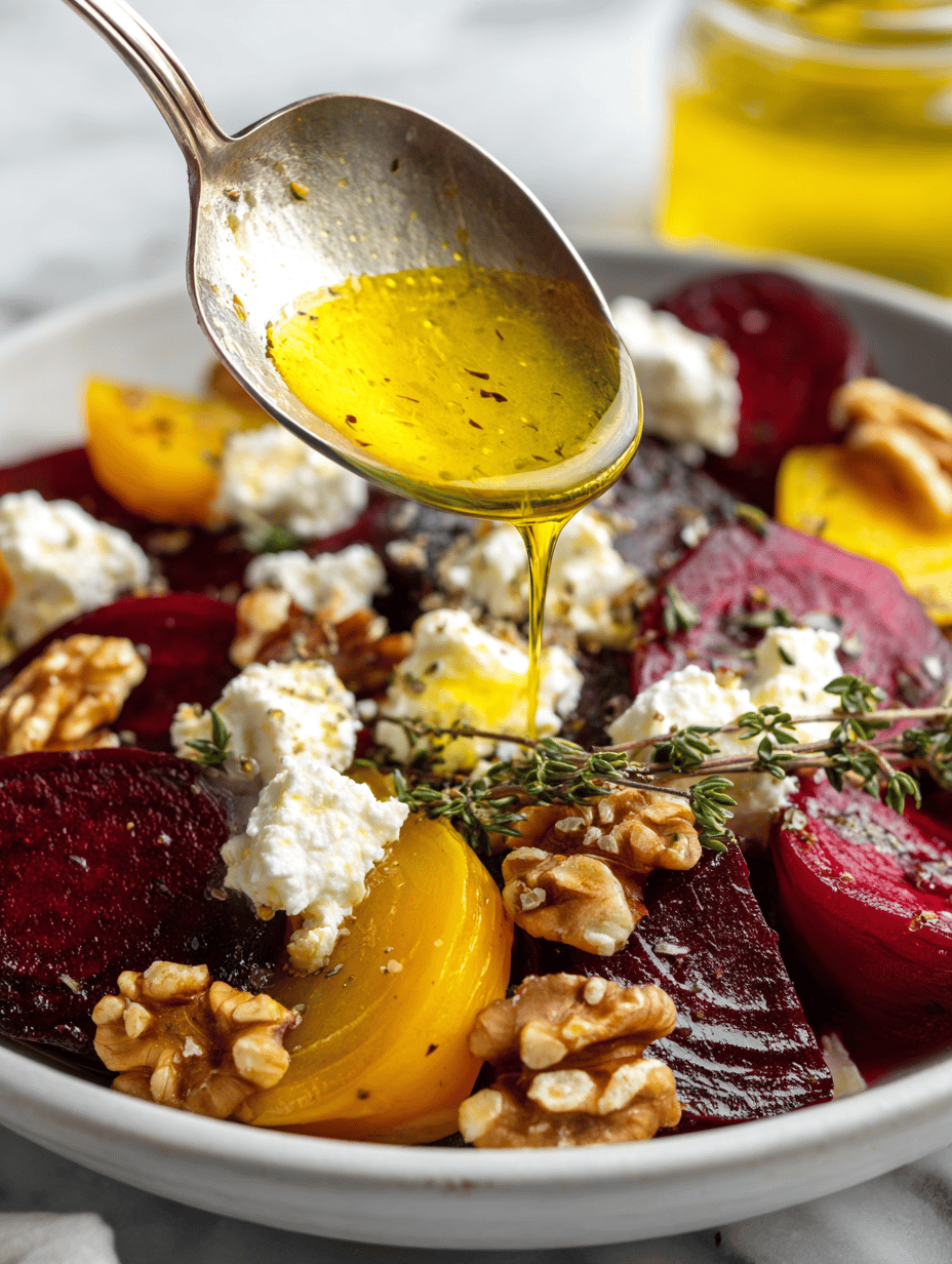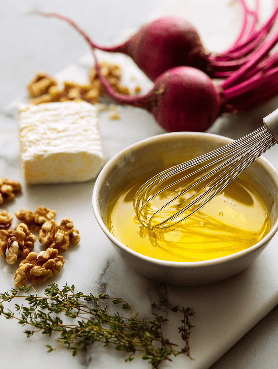 While the beets roast, prepare the dressing by whisking together olive oil, lemon juice, honey, salt, and pepper until well combined and slightly emulsified.