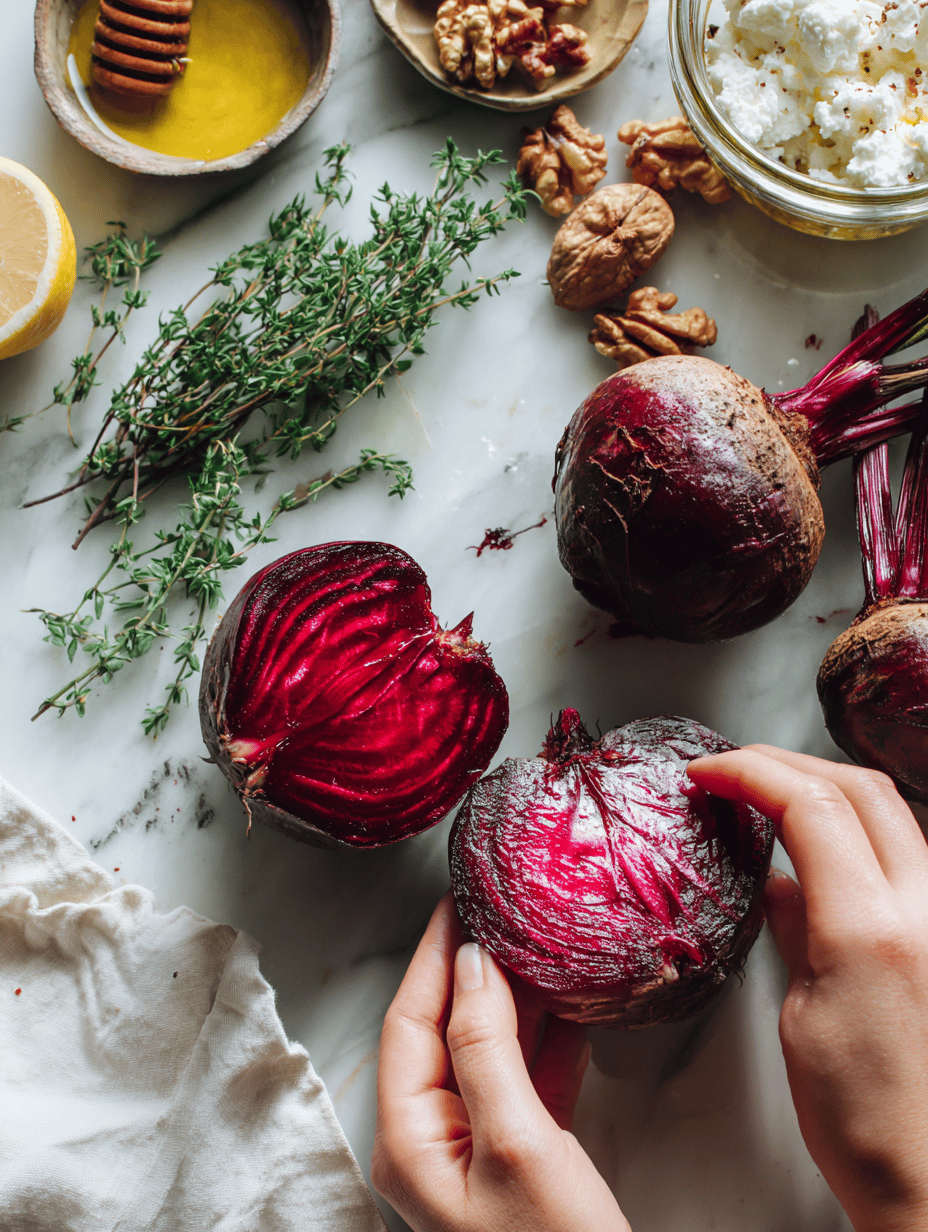 Once the beets are cool enough to handle, peel off the skins by rubbing gently with your fingers or a paper towel. The skins should come off easily and reveal vibrant, roasted flesh.