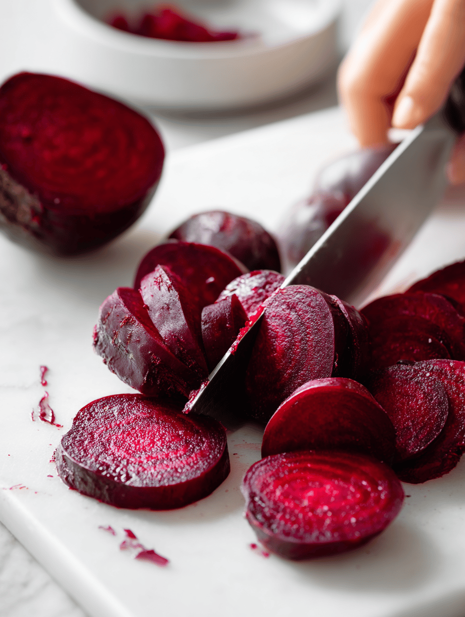 Slice the peeled beets into thick rounds, about 1 centimeter (0.4 inches) thick, to showcase their beautiful color and texture.