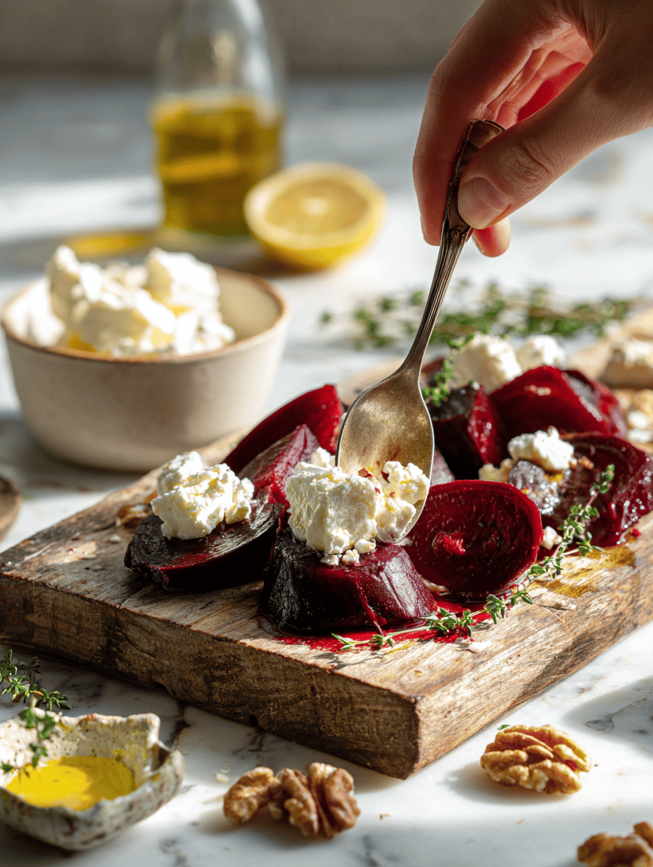 Crumble the goat cheese over the warm beet slices, allowing it to soften slightly for a creamy contrast.
