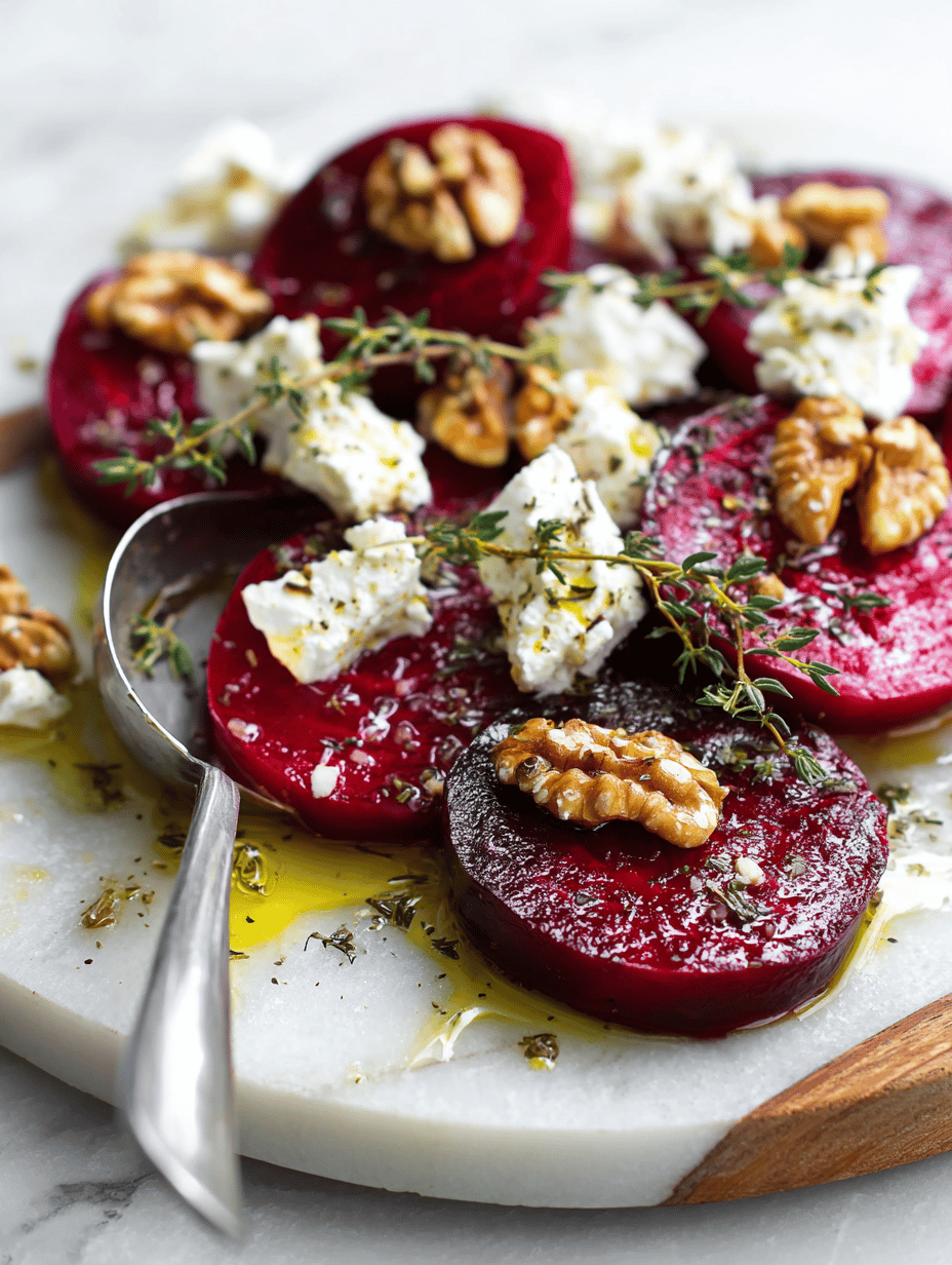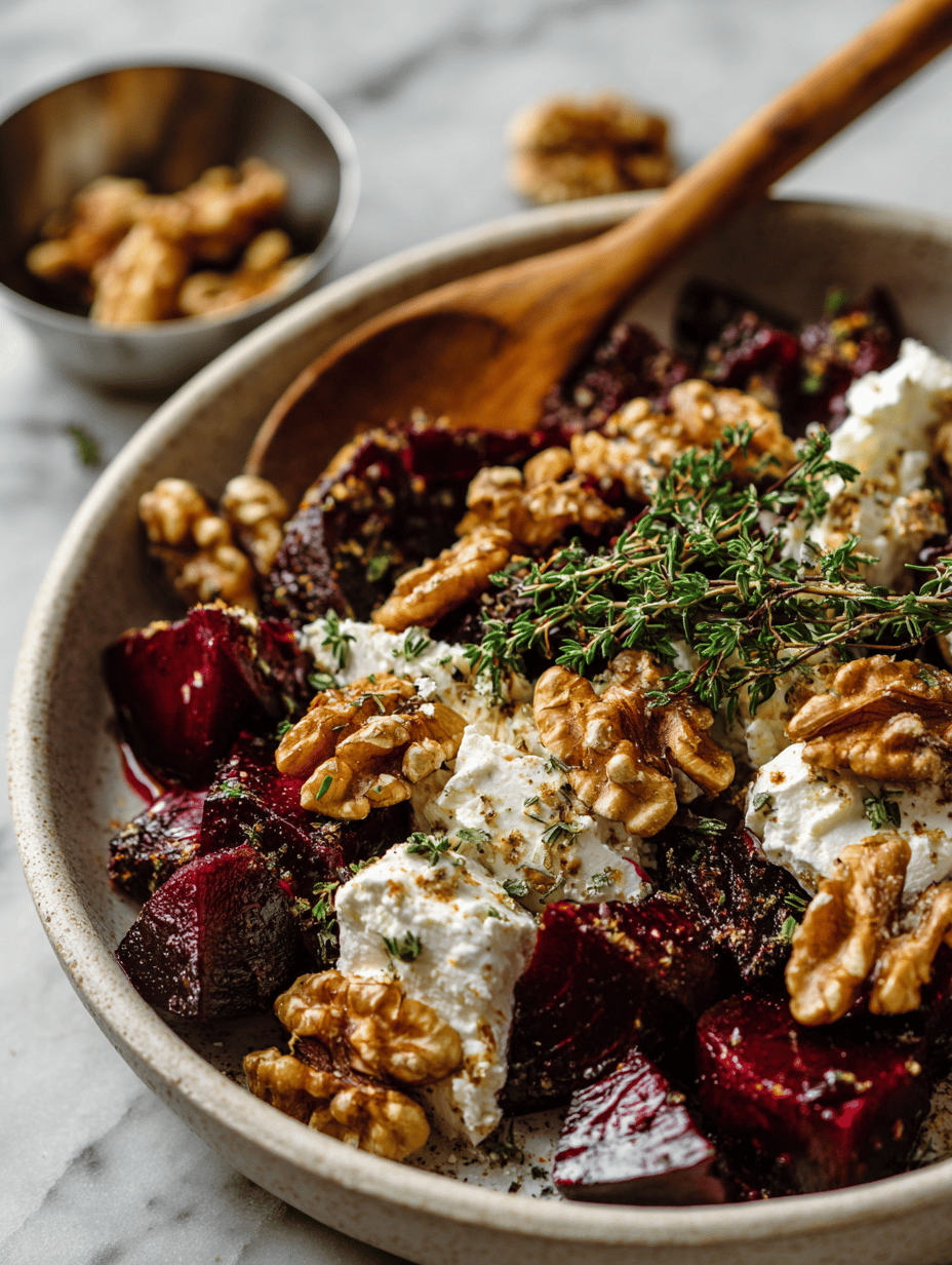 This salad features earthy roasted beets paired with creamy goat cheese and crunchy toasted walnuts, all drizzled with a bright lemon dressing. The beets are roasted until tender and caramelized, then sliced and combined with the other ingredients for a visually appealing and flavor-rich dish with a mix of soft, crunchy, and creamy textures. Perfect as a cozy starter or elegant side for fall dinners.