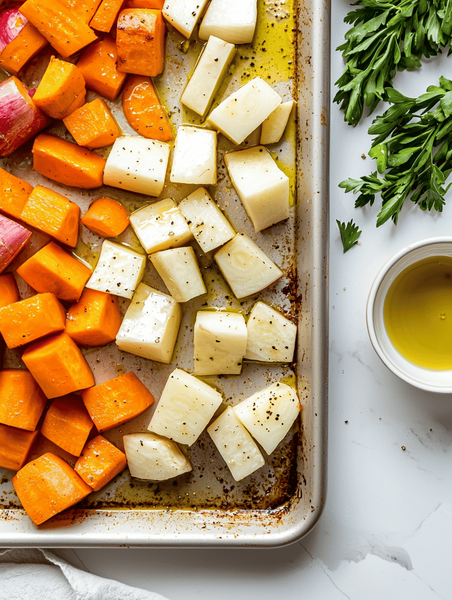 Preheat your oven to 400°F (200°C). Spread the chopped carrots, parsnips, and kohlrabi evenly on a baking sheet. Drizzle with olive oil and toss to coat.