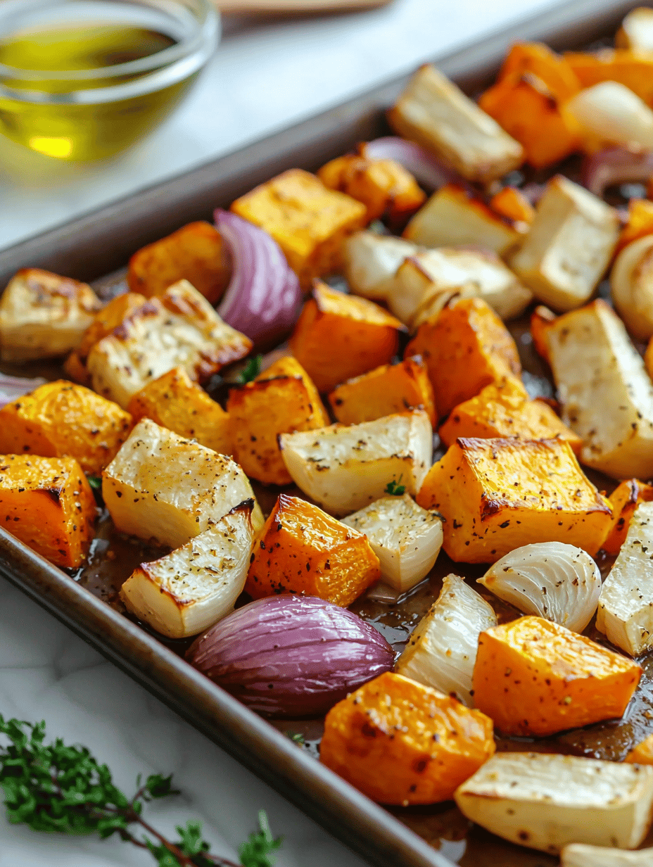 Roast the vegetables in the oven for about 25-30 minutes, until they are golden brown and caramelized at the edges, filling your kitchen with a warm, sweet aroma.