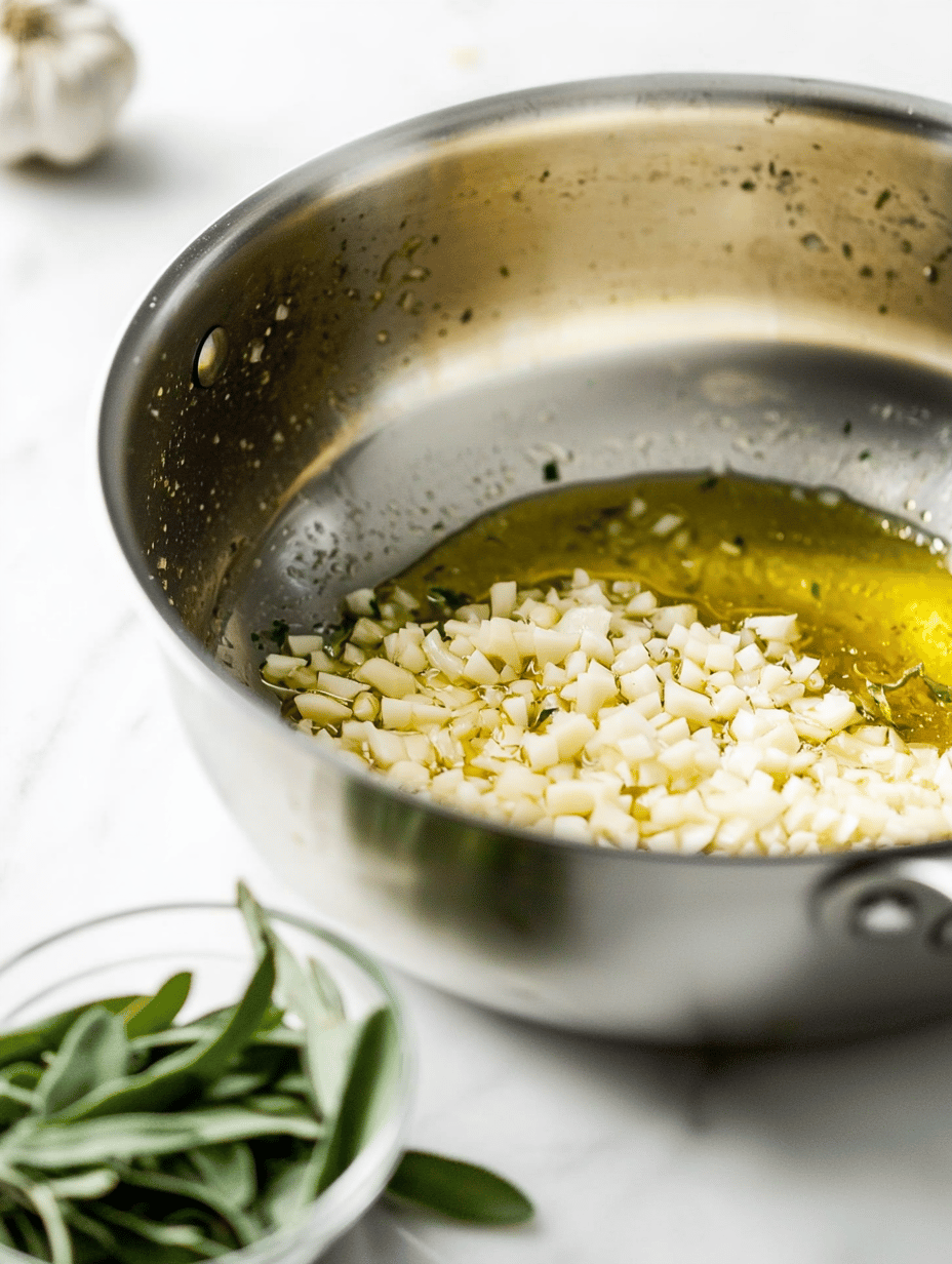 Meanwhile, heat a large pot over medium heat. Add a splash of oil and sauté the minced garlic with chopped sage until fragrant, about 1 minute, until the garlic turns golden.