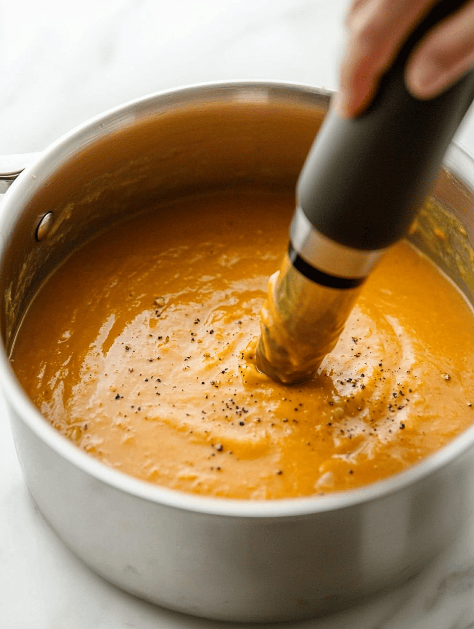 Use an immersion blender to carefully blend the soup until smooth and creamy. Alternatively, transfer the hot mixture to a blender and purée in batches, then return to the pot.