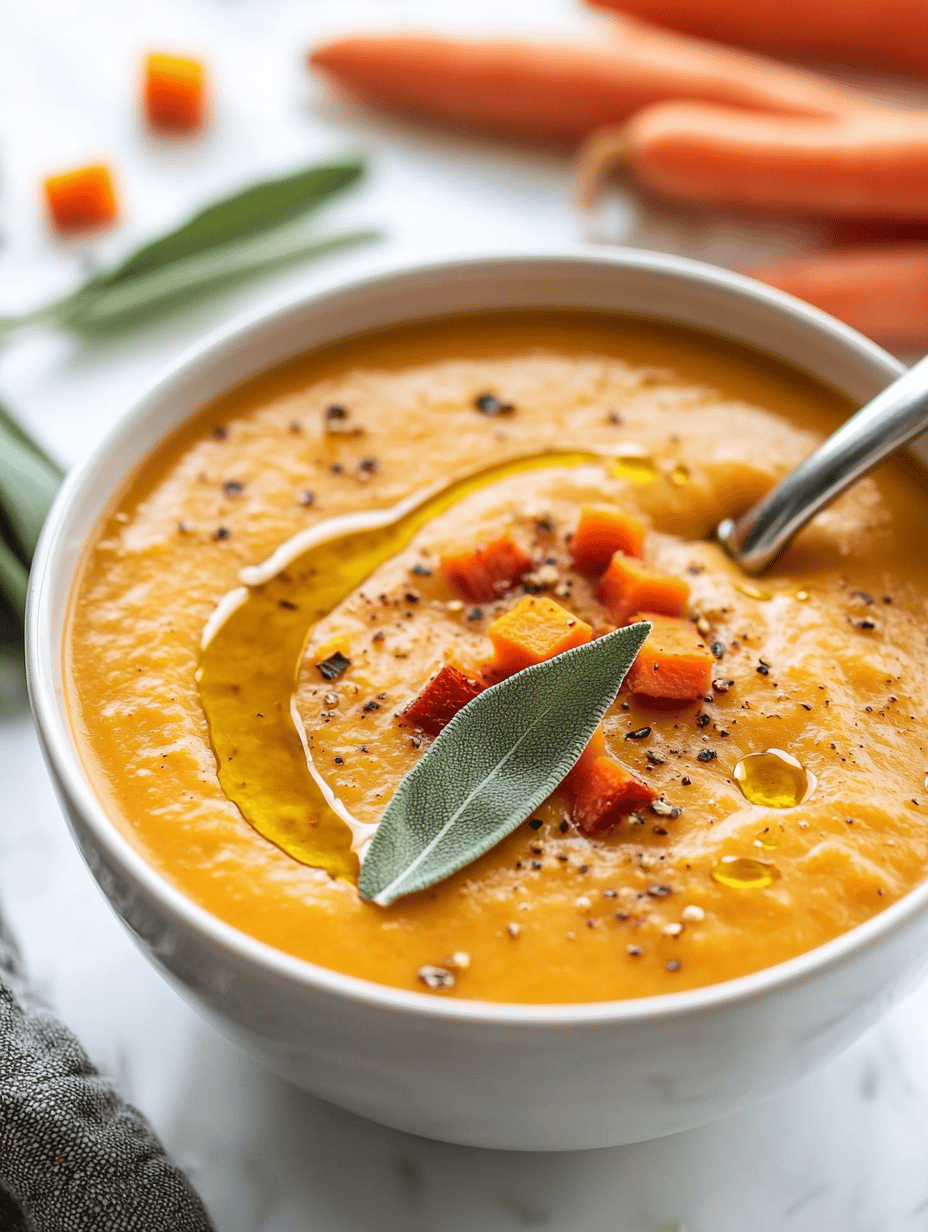 Warm the soup just until hot, then ladle into bowls. Garnish with a few fresh sage leaves or a drizzle of olive oil if desired. Serve immediately for a comforting, vibrant fall soup.
