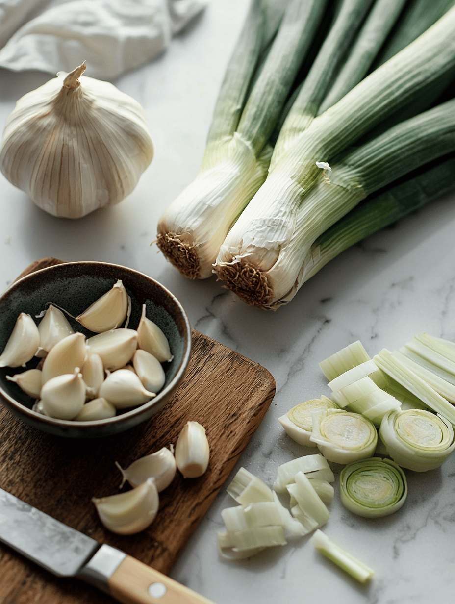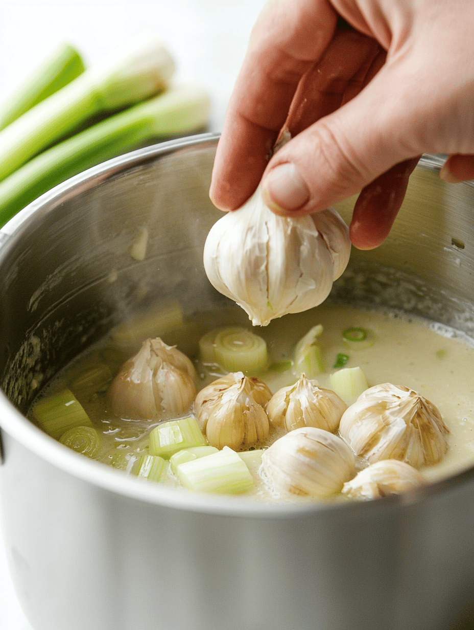 Once the garlic has roasted and cooled slightly, squeeze the softened cloves out of their skins directly into the pot with the leeks. Stir well to combine, allowing the garlic to mingle with the leeks’ sweetness.