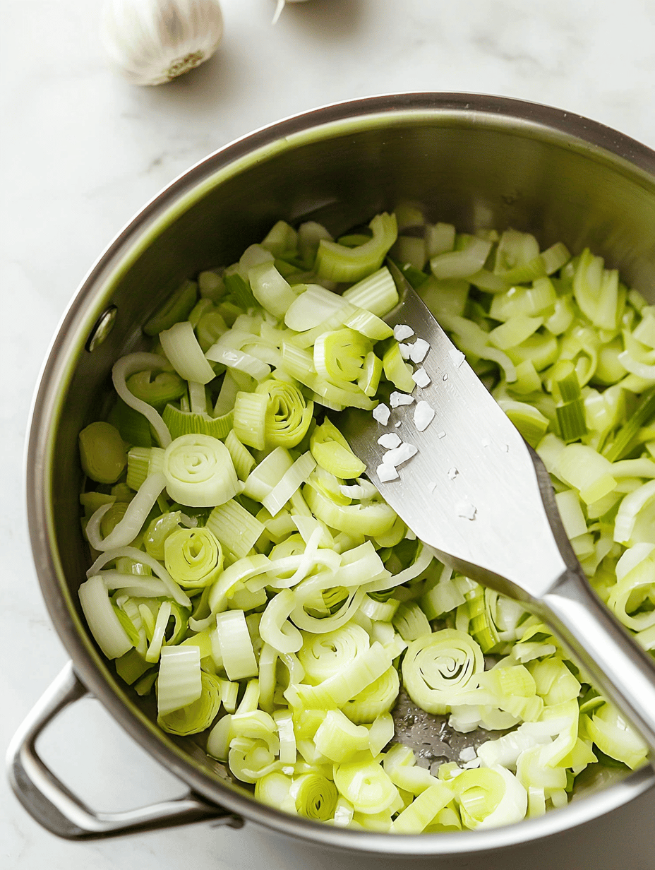 Heat the remaining tablespoon of olive oil in a large pot over medium heat. Add the chopped leeks and a pinch of salt, then cook gently for about 8-10 minutes until they soften and start to turn translucent, releasing a sweet aroma.