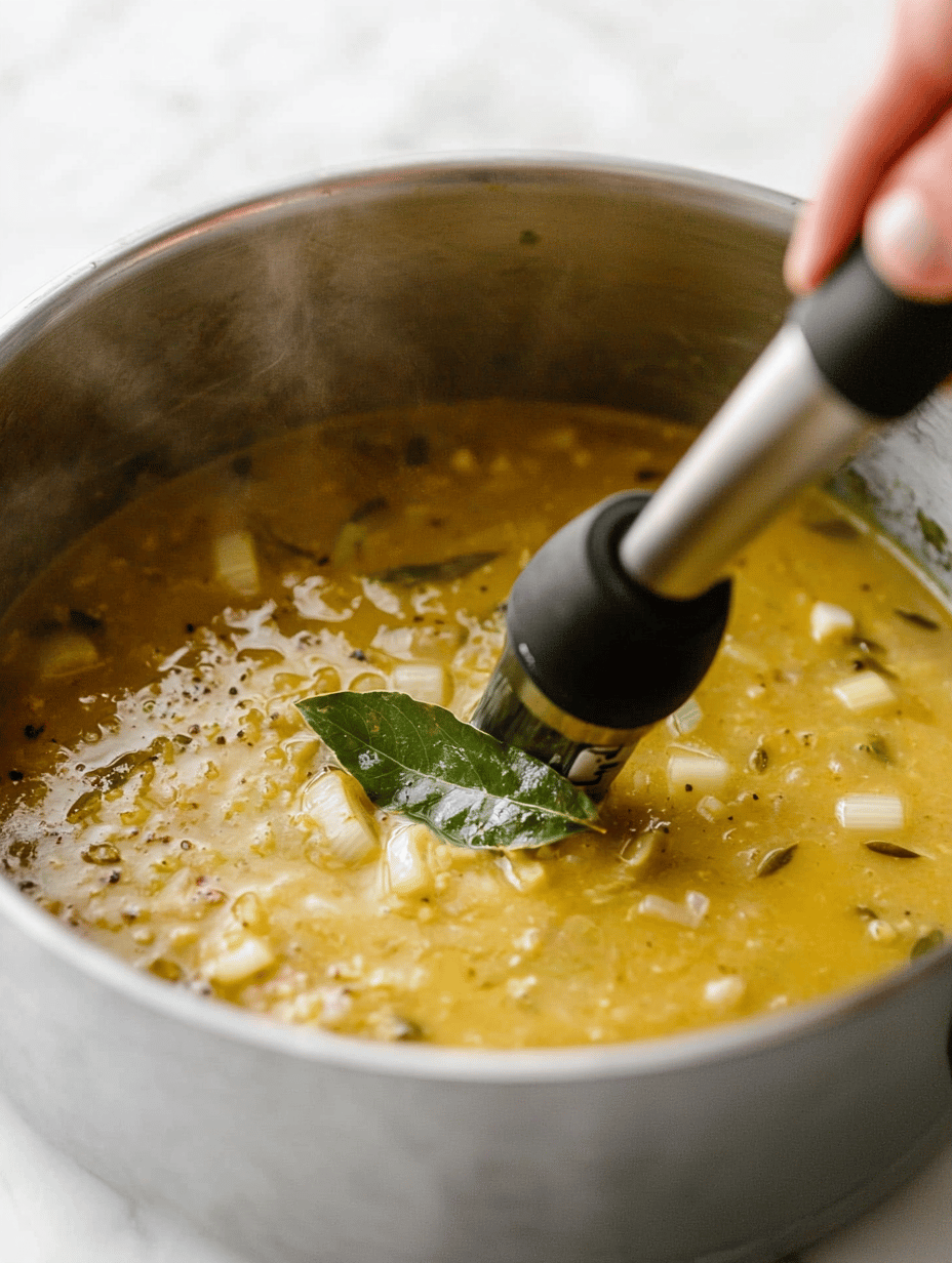 Remove the bay leaf, then use an immersion blender to blend the soup directly in the pot until smooth and velvety. Alternatively, transfer the mixture in batches to a food processor and blend until creamy.