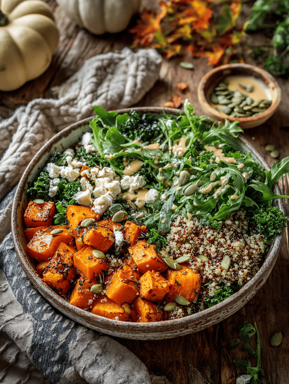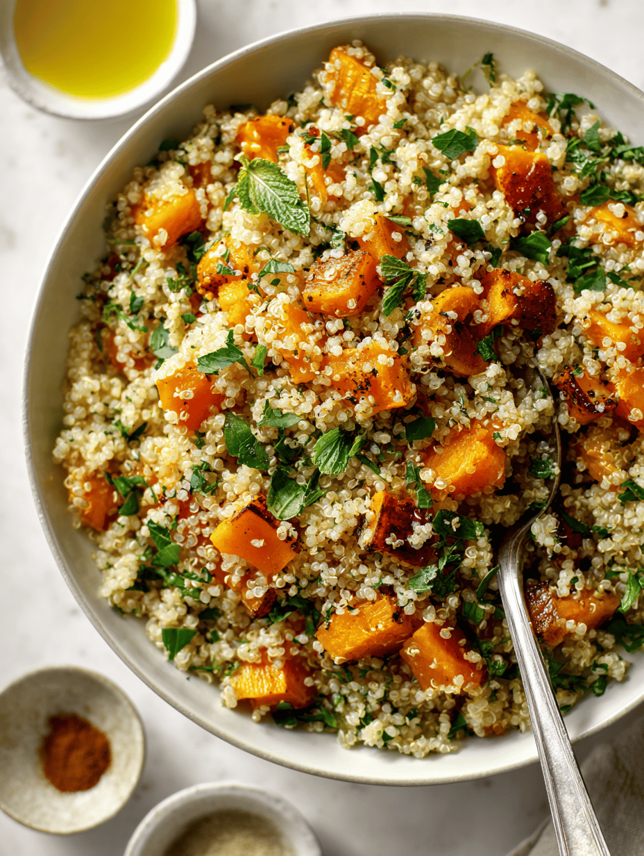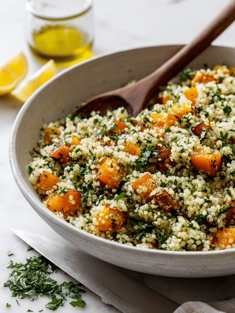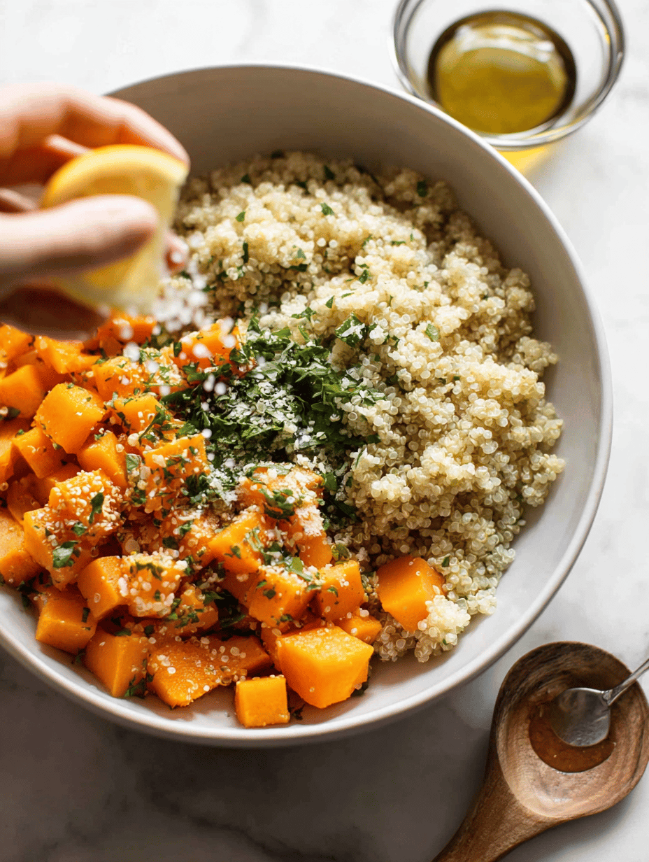Fluff the cooked quinoa with a fork and transfer it to a large mixing bowl. Add the slightly cooled roasted pumpkin pieces.