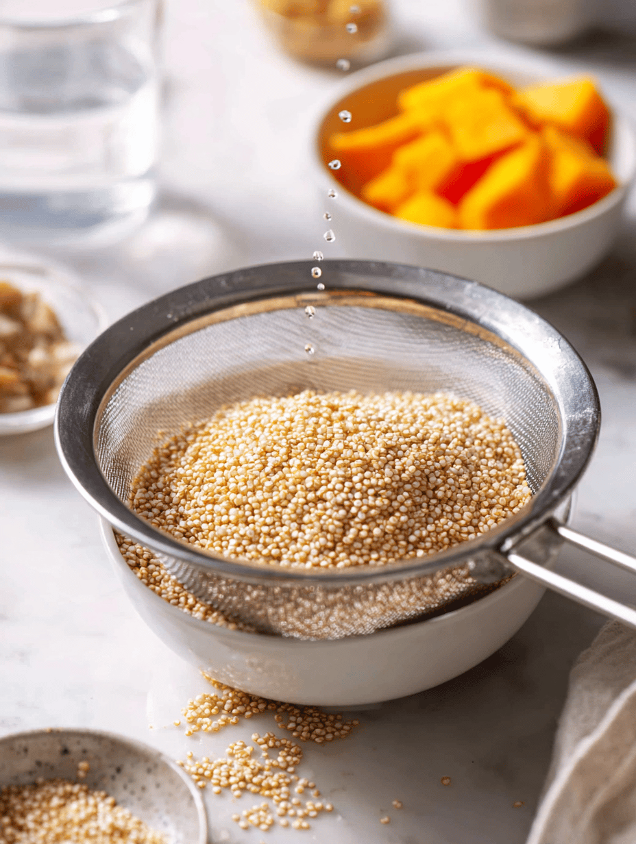 Rinse the quinoa thoroughly under cold water using a fine sieve to remove any bitterness, then drain well.