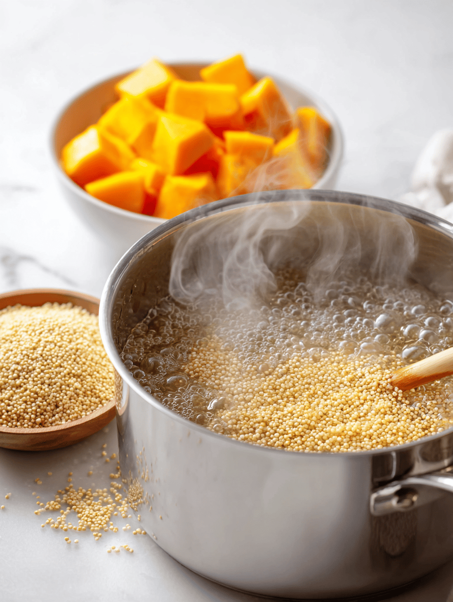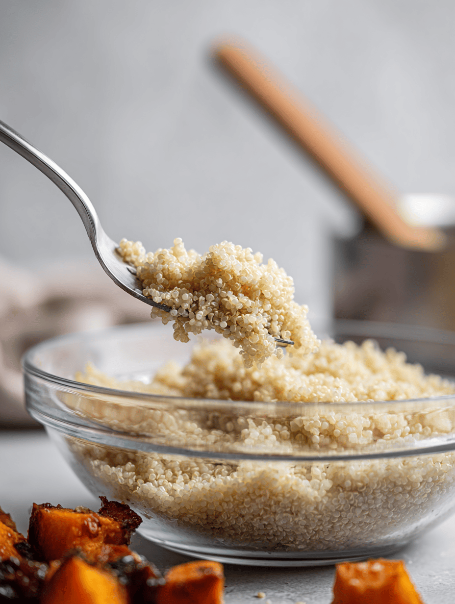 Bring water or vegetable broth to a boil in a medium pot. Add the rinsed quinoa, reduce the heat to low, cover, and simmer for about 15 minutes until the grains are fluffy and have a slight sheen.