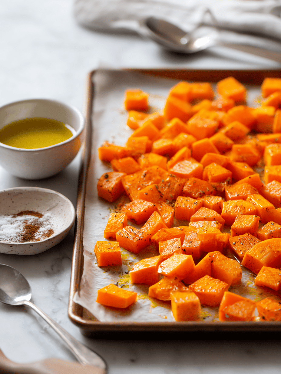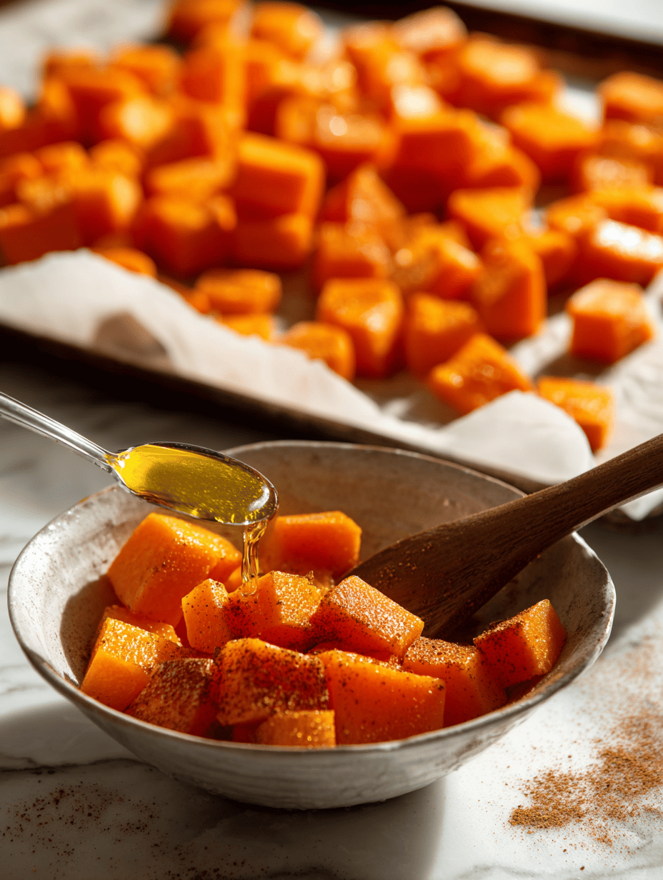 While the quinoa cooks, toss the diced pumpkin with a tablespoon of olive oil, cinnamon, salt, and pepper, then spread evenly on a baking sheet.