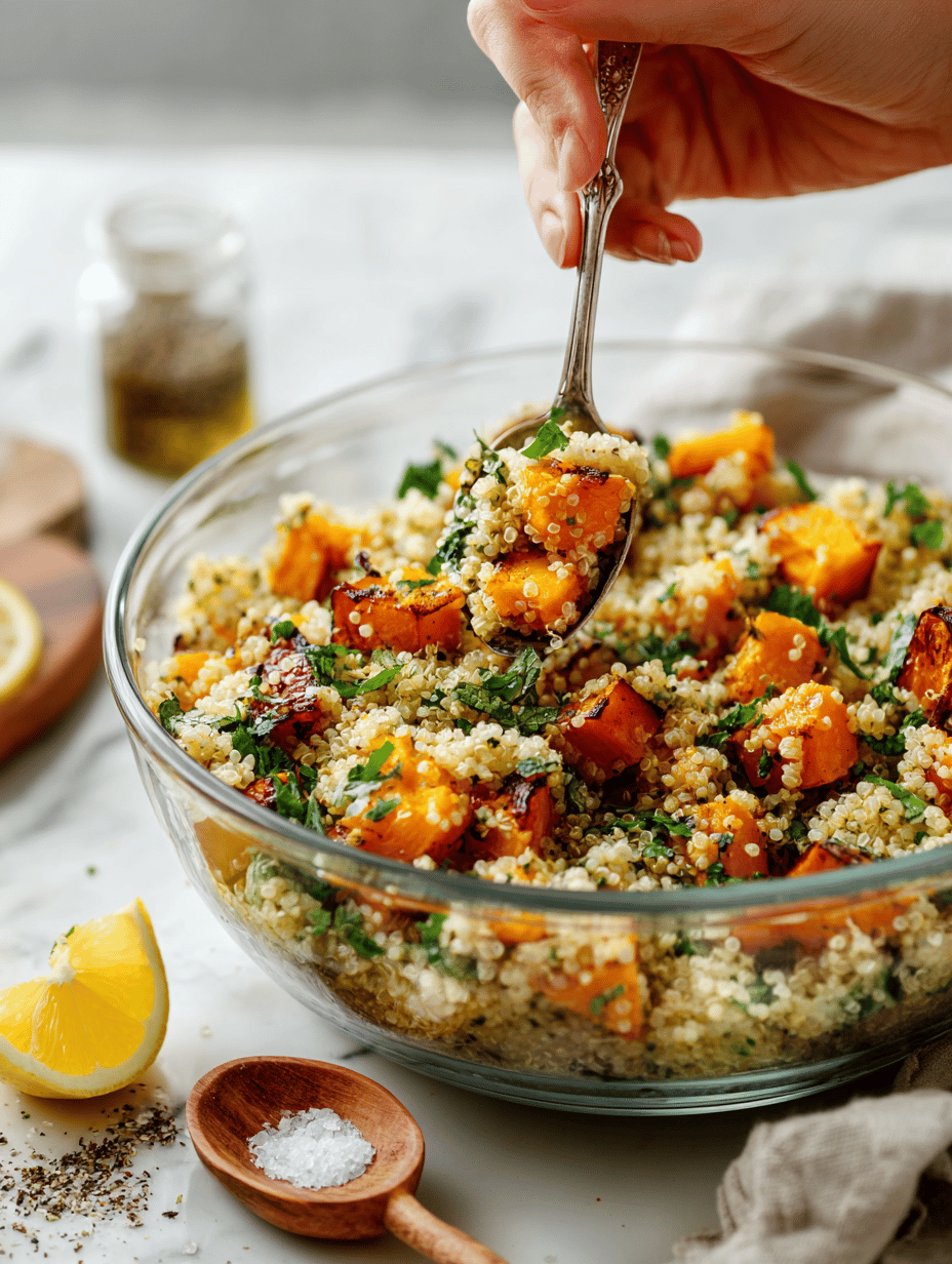 This vibrant pumpkin quinoa salad combines nutty, fluffy grains with tender roasted pumpkin, fresh herbs, and bright citrus. The dish features a warm spice blend and a lively lemon dressing, resulting in a textured, colorful, and satisfying salad perfect for any season. It balances hearty and fresh elements with a comforting yet lively appeal.