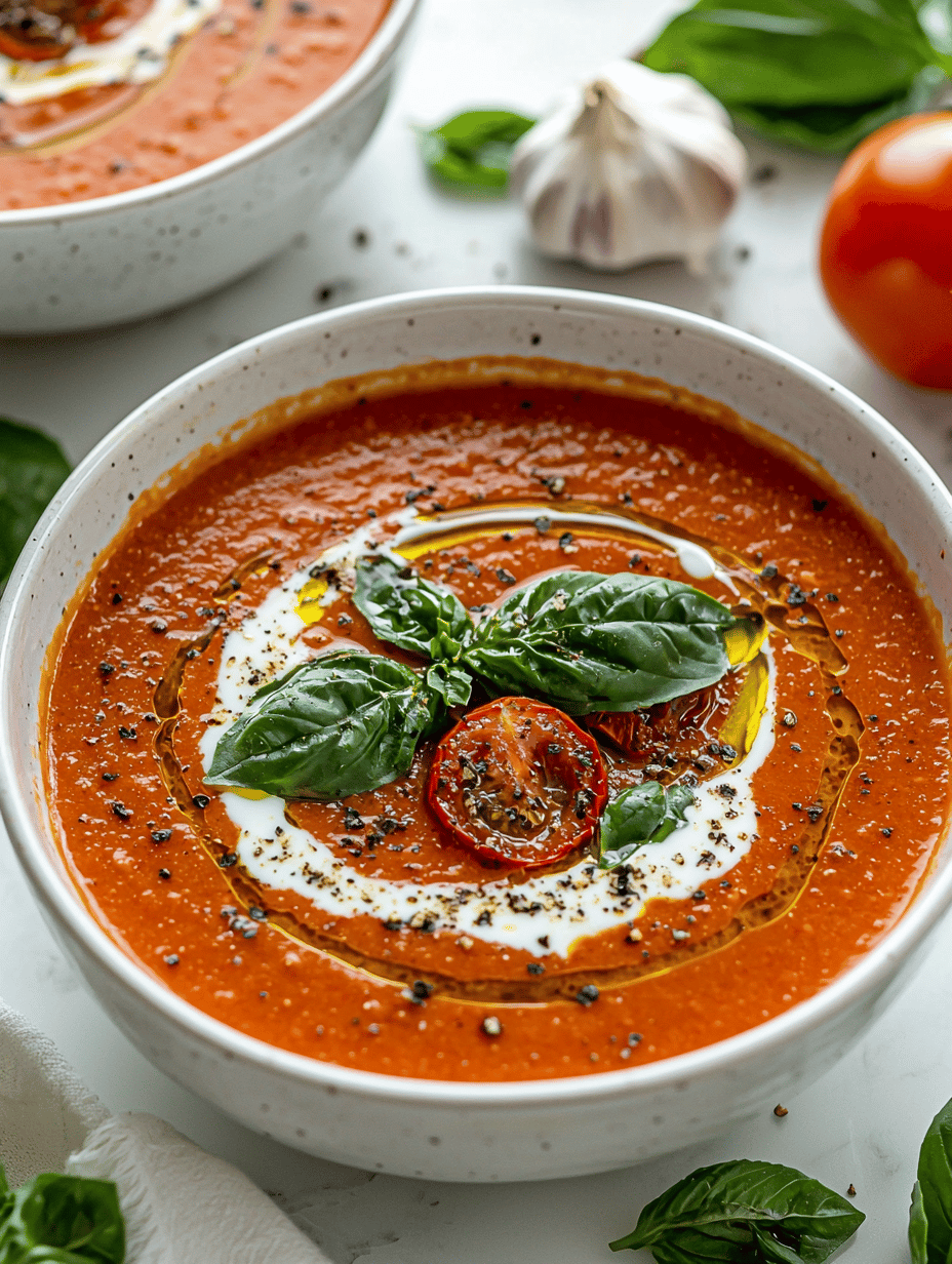 Taste the soup and adjust seasoning with additional salt and pepper if needed. Ladle into bowls, garnish with chopped fresh basil if desired, and serve hot for a comforting, velvety tomato soup.