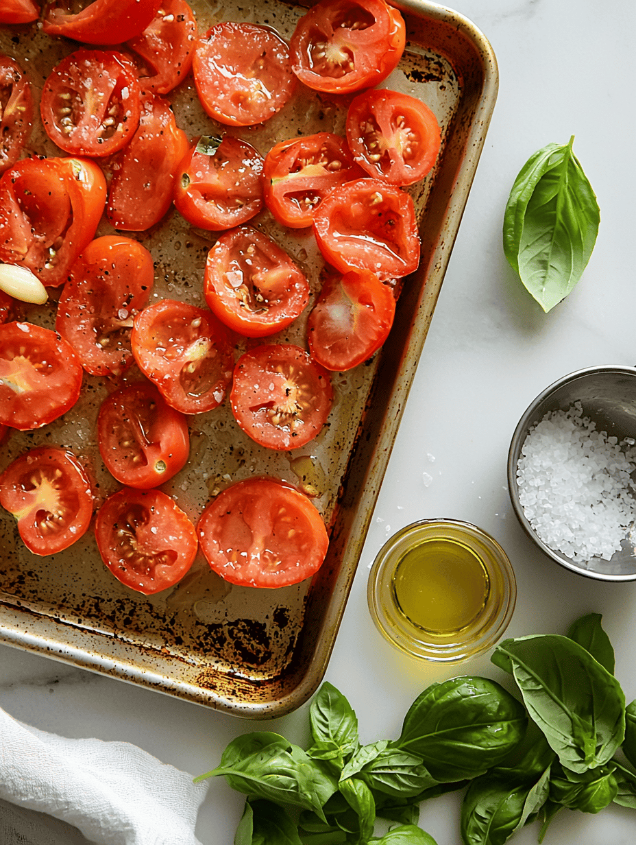 Preheat your oven to 400°F (200°C) and toss the chopped tomatoes with a tablespoon of olive oil and a pinch of salt. Spread them on a baking sheet and roast for about 25 minutes until they are bubbly and slightly caramelized at the edges.