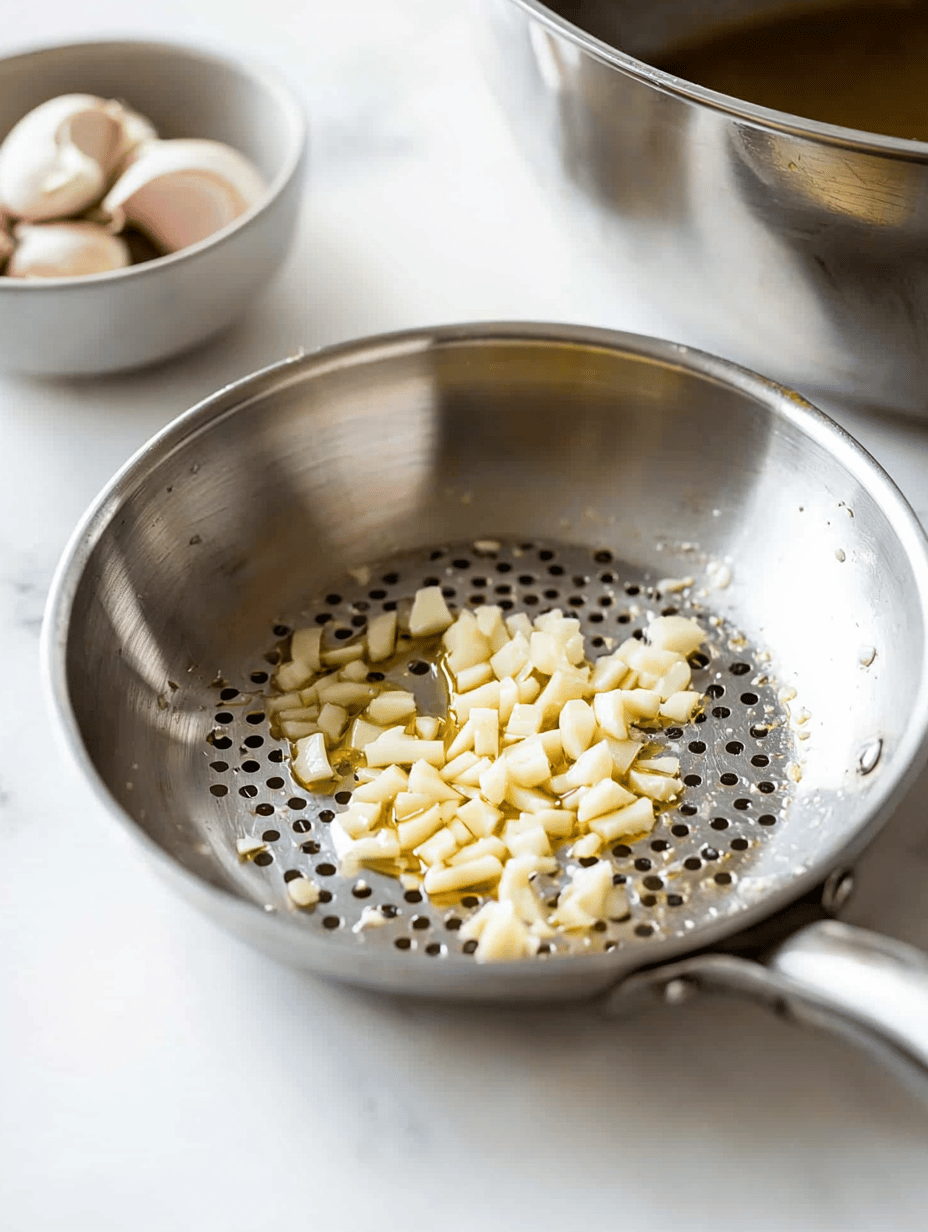 While the tomatoes are roasting, heat a small amount of olive oil in a skillet over medium heat. Add the minced garlic and cook until fragrant, about 1 minute, until it becomes golden and aromatic.