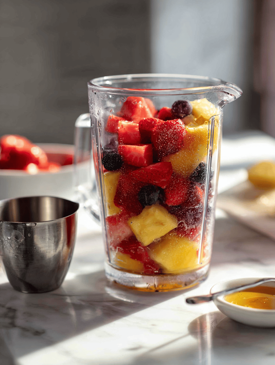 Measure out the fruit, whether fresh and chopped or frozen, and add it to your blender.