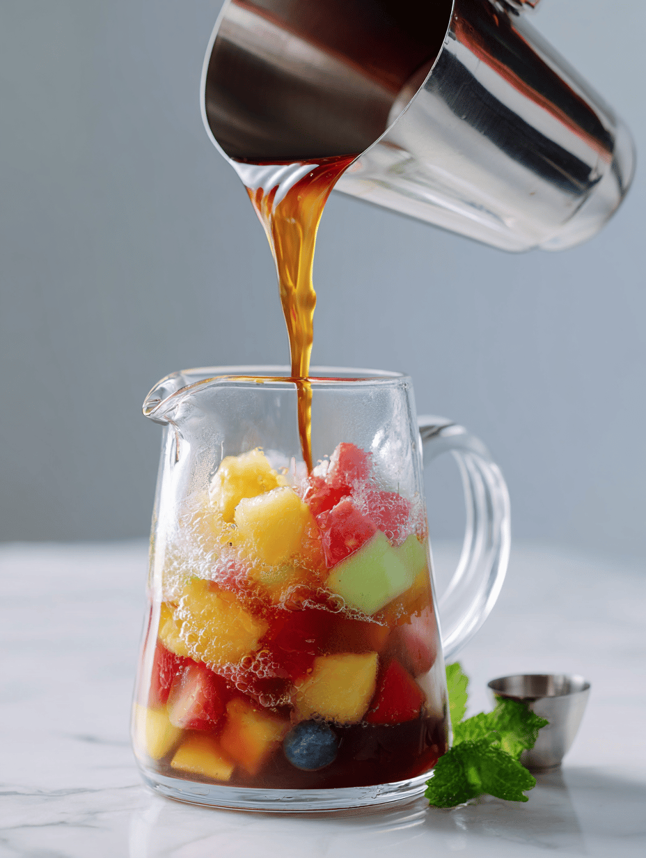 Pour in the rum, then add the honey or simple syrup and citrus juice. This layer of ingredients should look colorful and inviting.