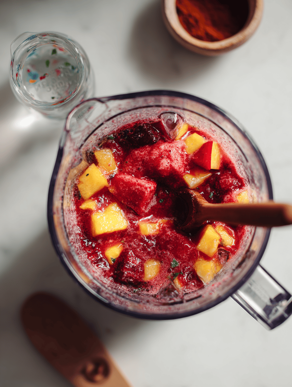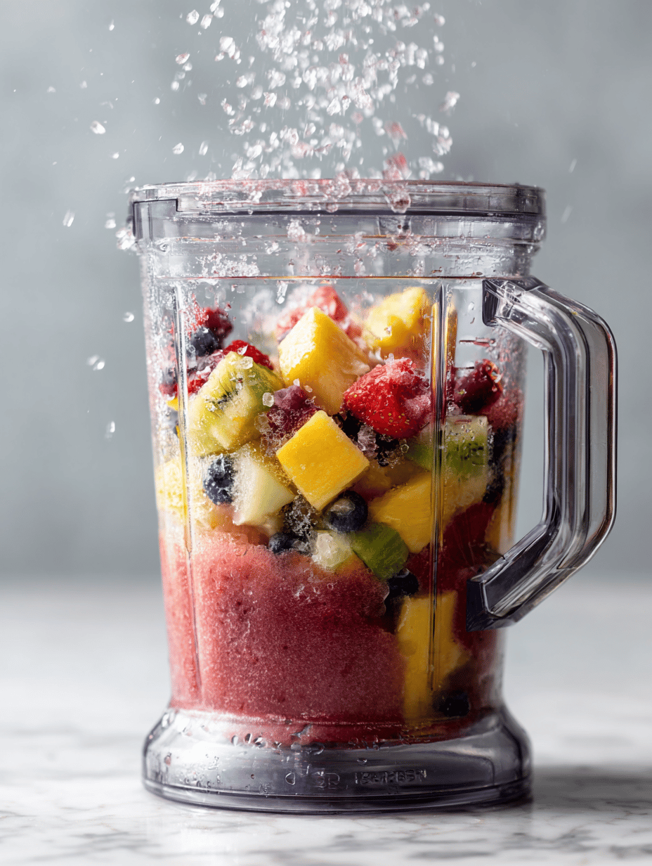 Stop the blender and check the texture—if it’s too thick, add a splash of water or juice and blend briefly; if too runny, add more ice and blend again until it’s just right.