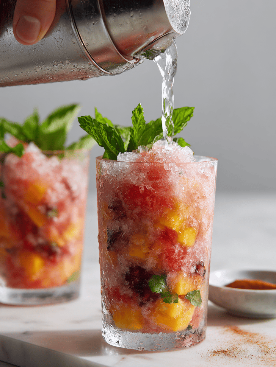 Pour the slushie into glasses, garnish with mint leaves or a sprinkle of cinnamon if using, and let sit for 1-2 minutes to firm up slightly.