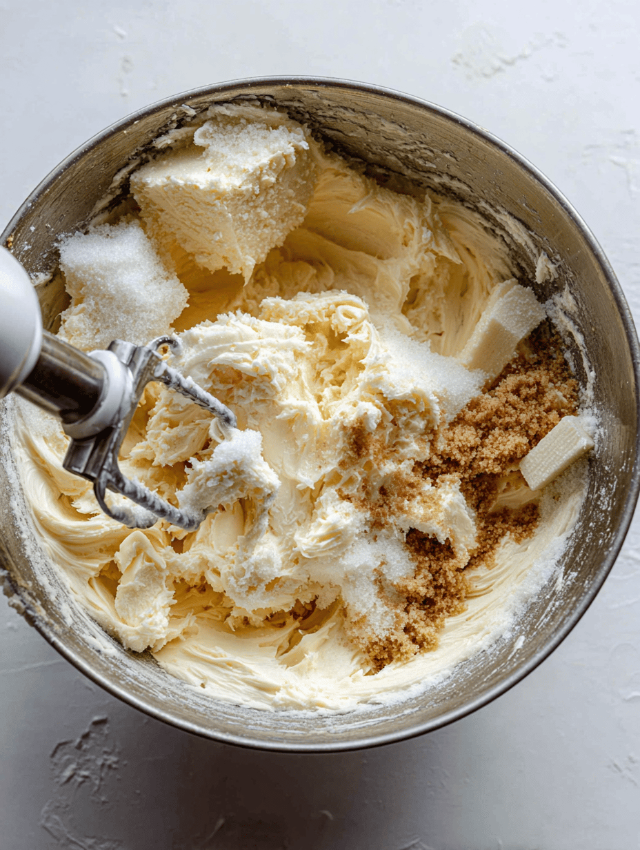 In a large bowl, beat the softened butter with white and brown sugars until the mixture is pale, fluffy, and fragrant, about 2 minutes.