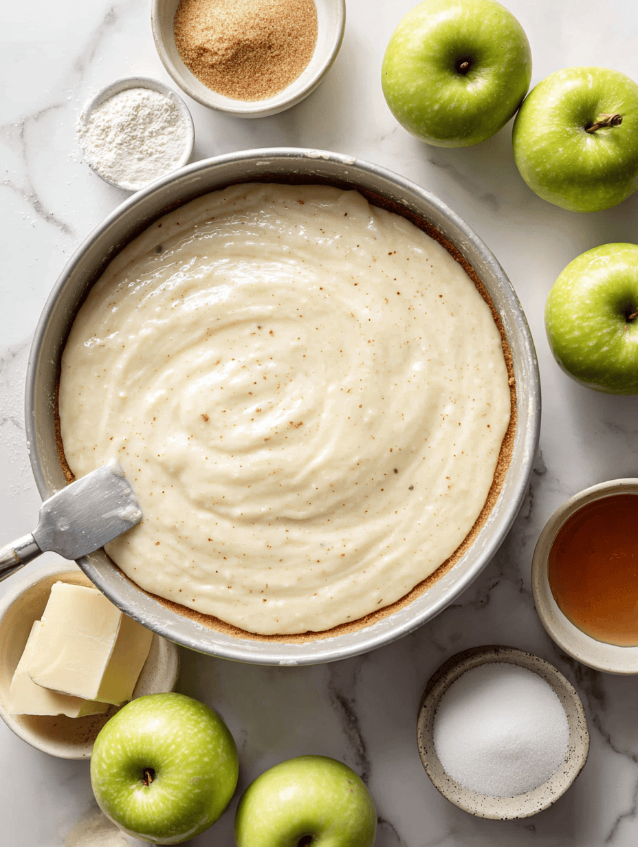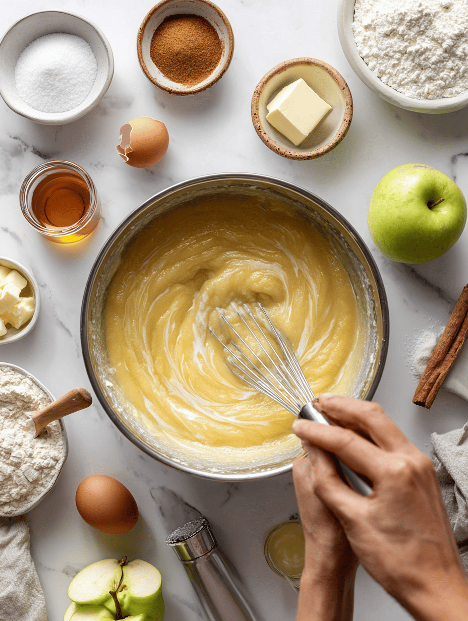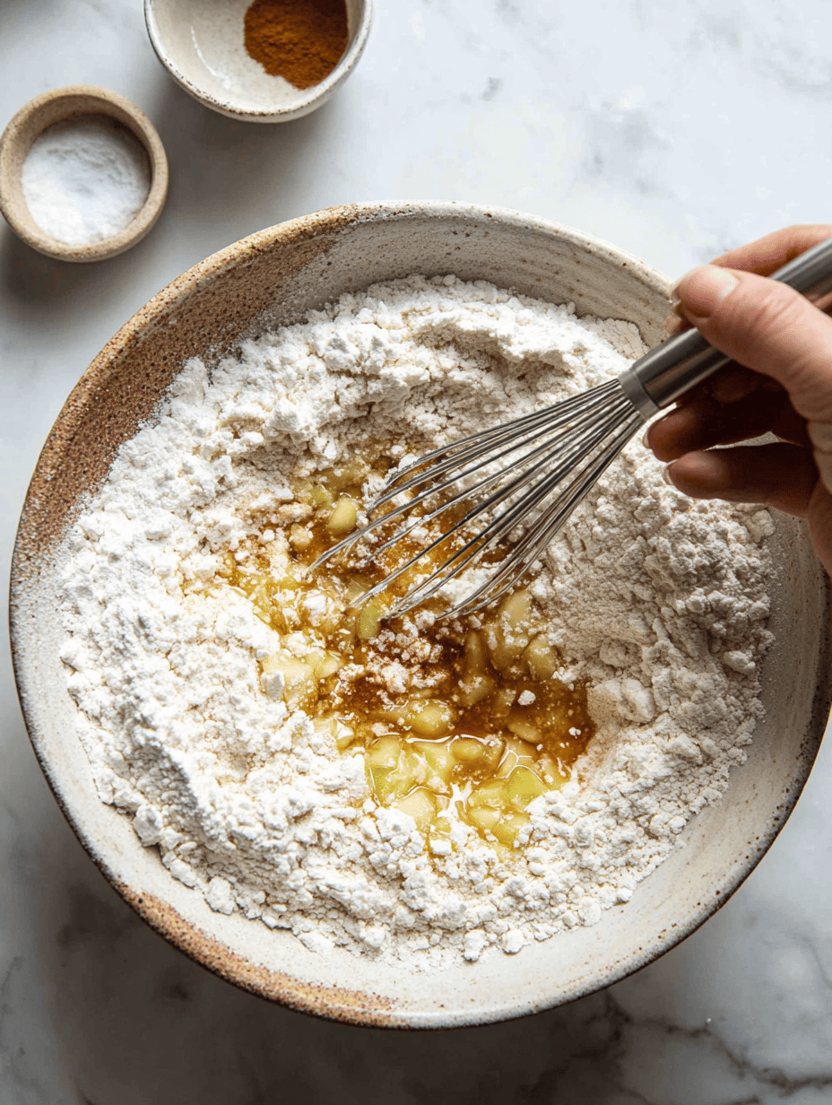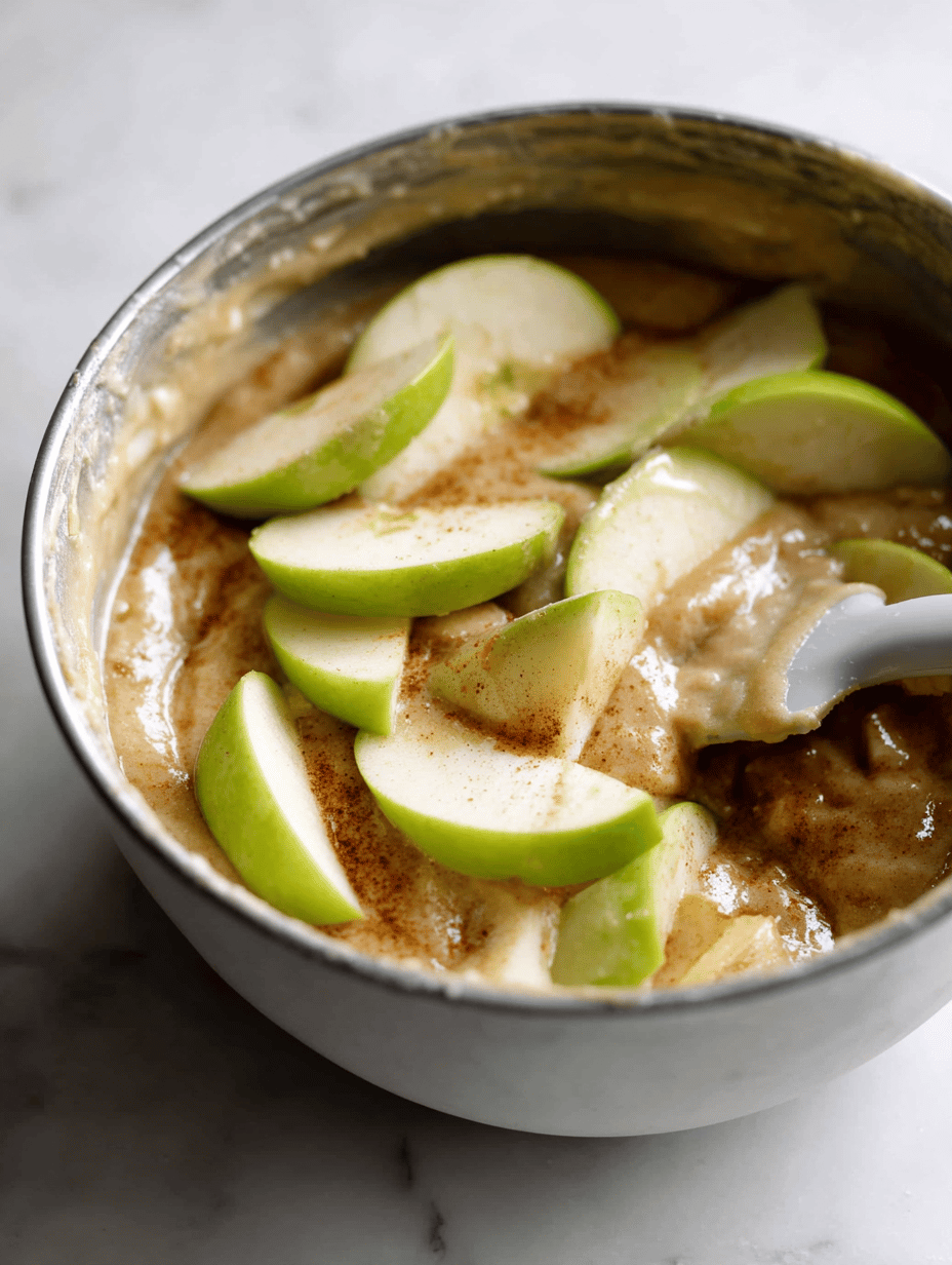Gently fold in the sliced apples, ensuring they are evenly coated with the batter. The mixture will be thick but moist.
