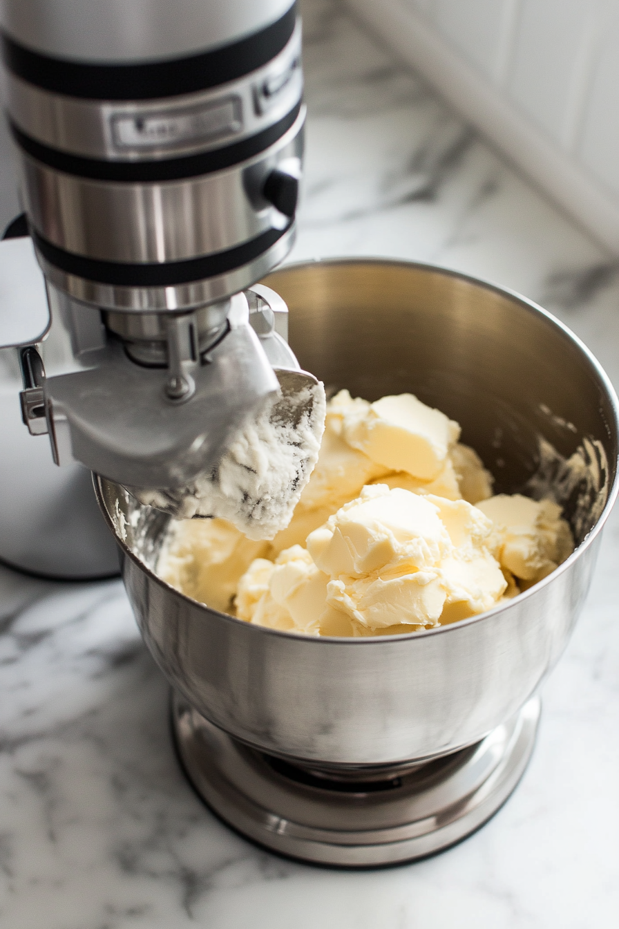 Cream together butter and sugars in a stand mixer until smooth, light, and fluffy (about a few minutes).