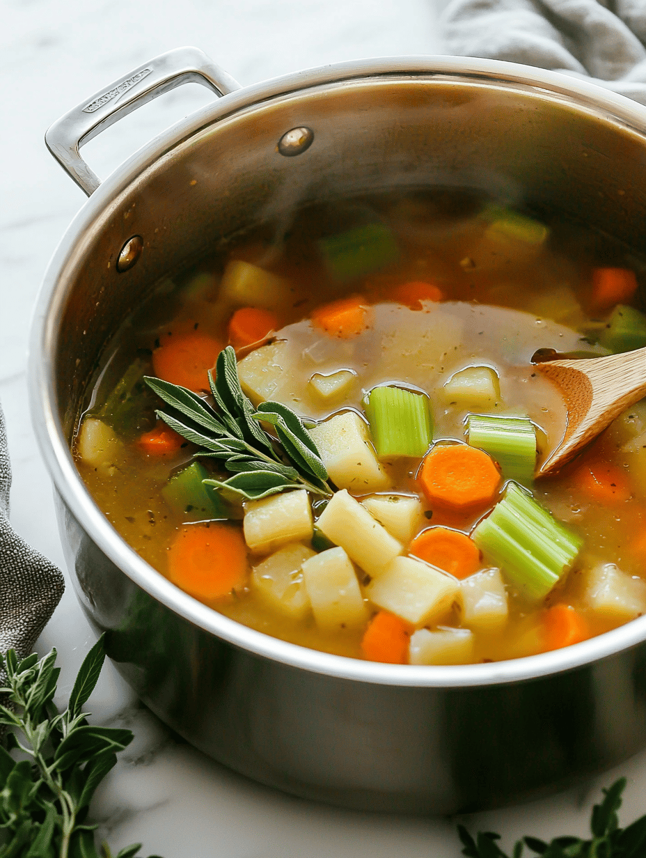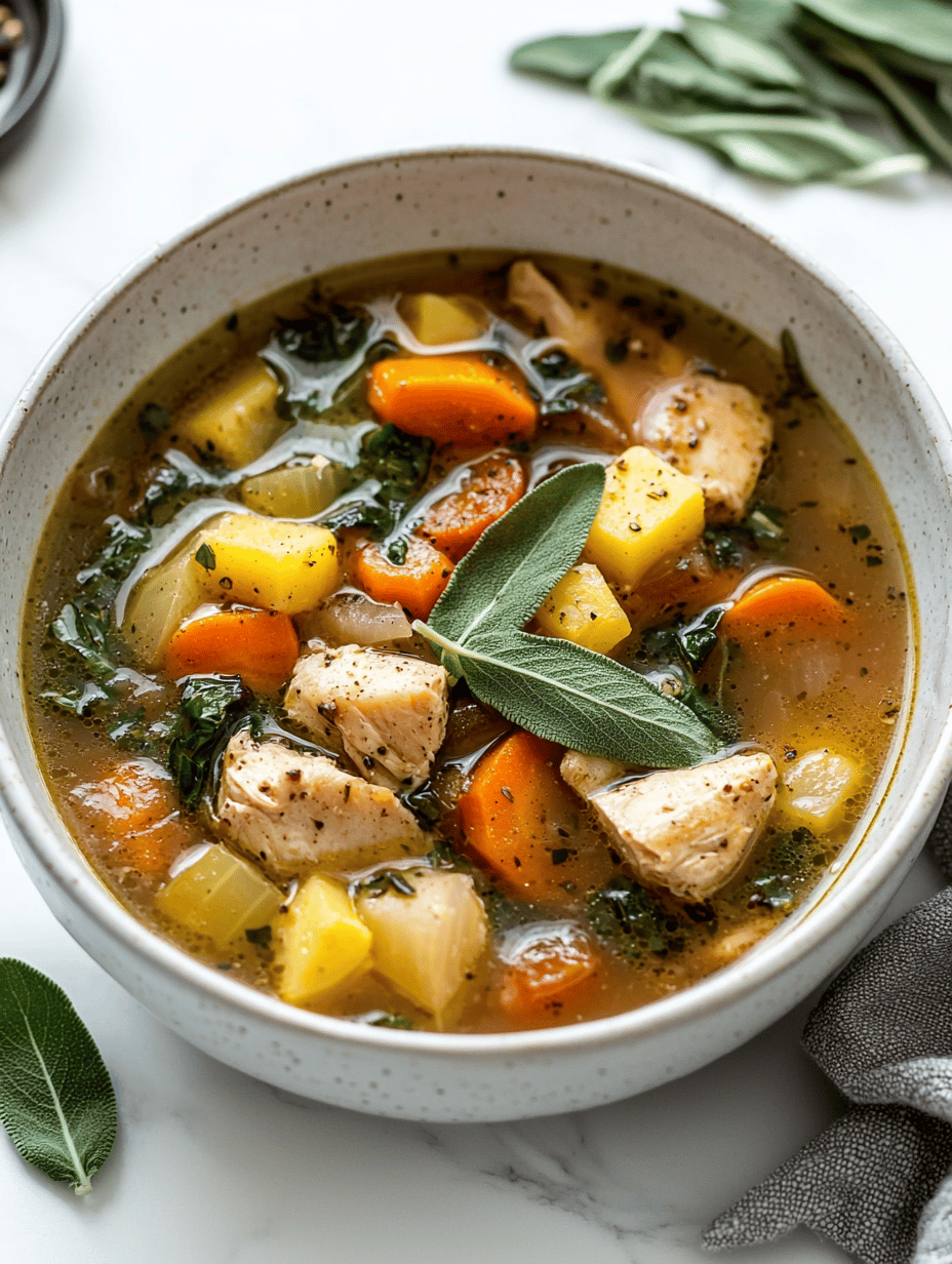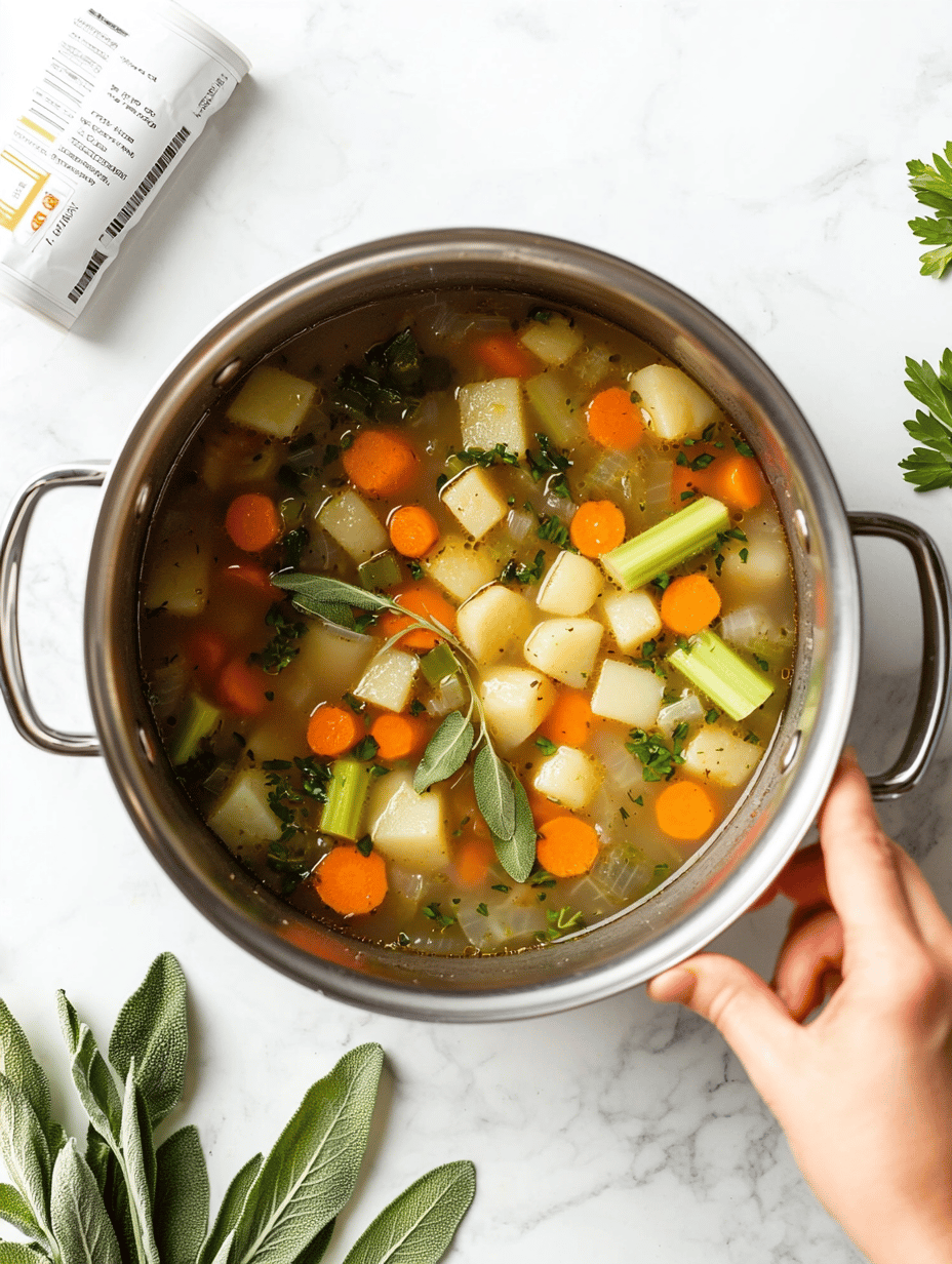 Pour in the sage-infused chicken broth and bring the mixture to a gentle simmer. Cover the pot and let it cook for about 30 minutes, or until the vegetables are tender and the flavors meld together.