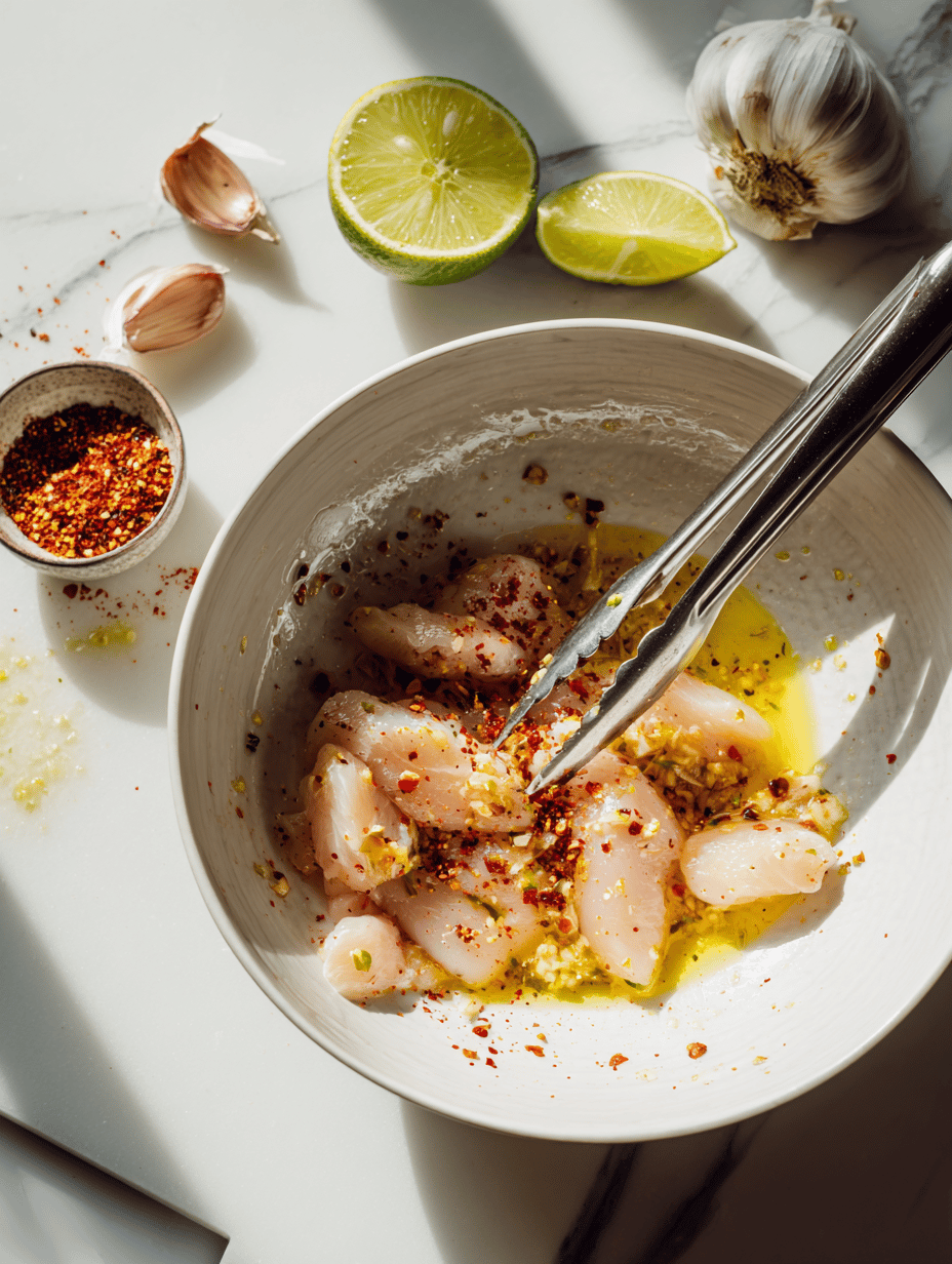 Mix lime juice, chili powder, minced garlic, salt, and oil in a bowl. Add chicken strips and toss to coat evenly. Marinate for at least 15 minutes to infuse flavor.