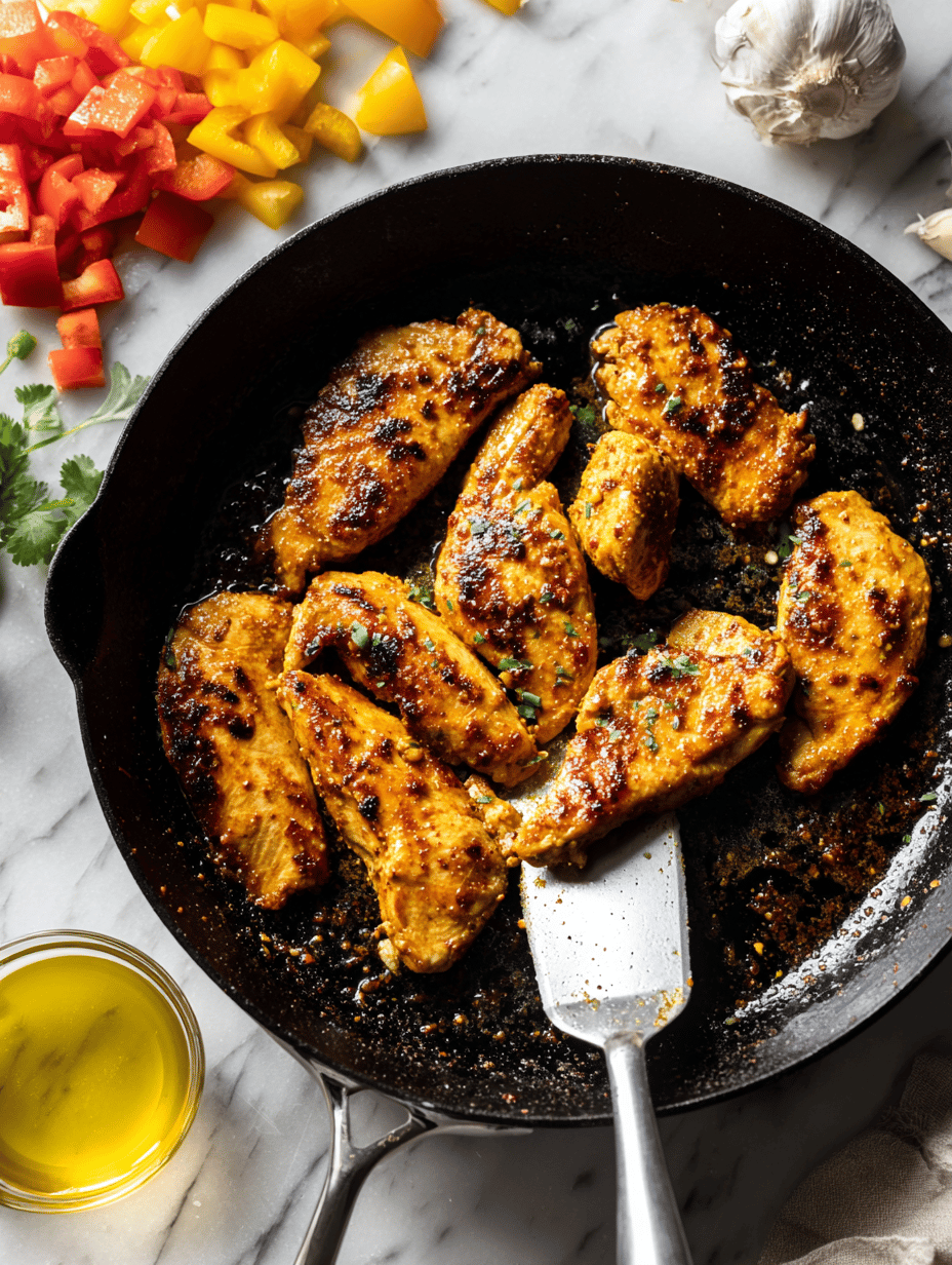 Heat your skillet or grill pan over medium-high heat until hot. Place the marinated chicken in the pan and cook for 6-8 minutes, flipping once, until golden brown and cooked through. The chicken should reach an internal temperature of 75°C (165°F) and juices should run clear.