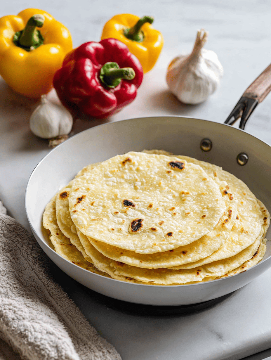 Warm the corn tortillas in a dry skillet or microwave for about 30 seconds until soft and pliable. Keep them wrapped in a towel to stay warm.
